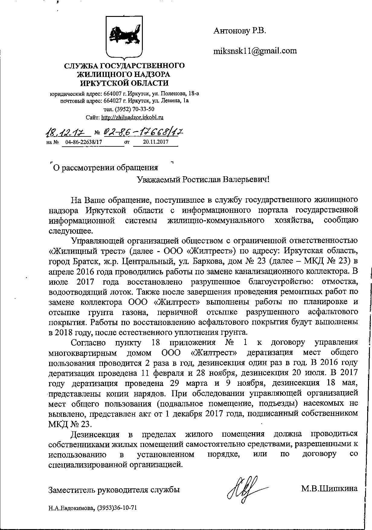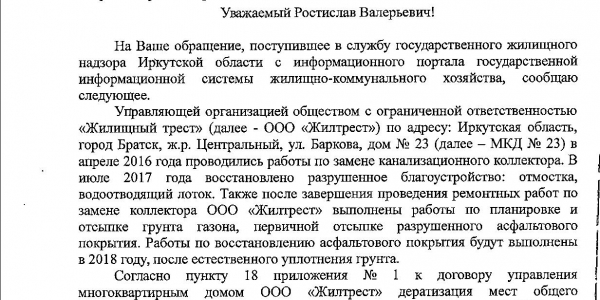 Номер жалобы:26799 Тип жалобы:Прочее Название объекта:Администрация Братска Регион:Иркутская область Город:Братск Адрес:ул. Баркова, 23 Описание жалобы:В доме складывается неблагоприятная сан. Атмосфера. Развелись насекомые вредители. Расплодились клопы и тараканы. Соседи массово делают ремонты, выкидывают мебель. Травить локально боимся что не эффективно. Началось это после того как провели ремонт труб канализации и так и не устранили последствия - у подъезда яму засыпали землей. Подъездная прощадка проседает, коллекторы провалились. Необходима массовая сан обработка дома! Статус: