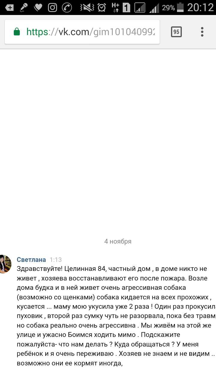 Номер жалобы:26813 Тип жалобы:Прочее Название объекта:Собака Из Будки Кидается На Прохожих Регион:Пермский край Город:Пермь Адрес:ул. Целинная, 84 Описание жалобы:Здравствуйте! Целинная 84, частный дом , в доме никто не живет , хозяева восстанавливают его после пожара. Возле дома будка и в ней живет очень агрессивная собака (возможно со щенками) собака кидается на всех прохожих , кусается ... маму мою укусила уже 2 раза ! Один раз прокусила пуховик , второй раз сумку чуть не разорвала, пока без травм, но собака реально очень агрессивна . Мы живём на этой же улице и ужасно Боимся ходить мимо . Подскажите пожалуйста- что нам делать ? Куда обращаться ? У меня ребёнок и я очень переживаю . Хозяев не знаем и не видим .. возможно они ее кормят иногда