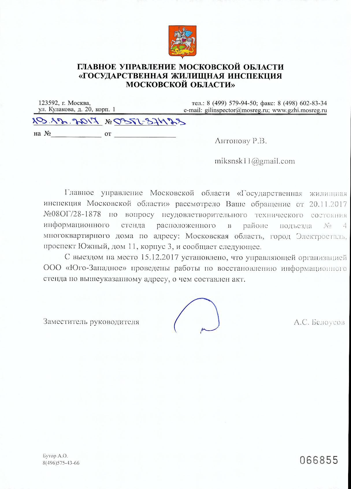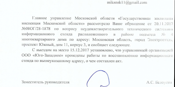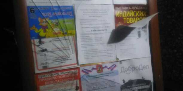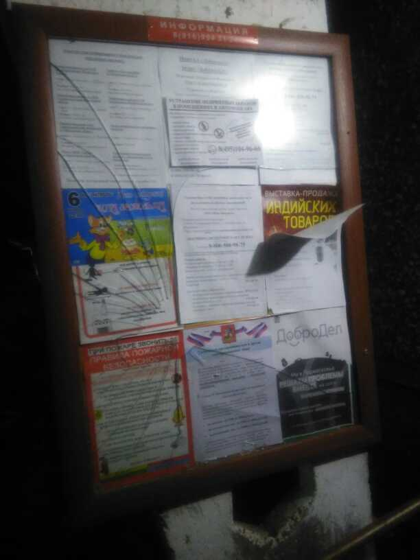 Номер жалобы:26816 Тип жалобы:Прочее Название объекта:Разбит стенд для объявлений и информации Регион:Московская область Город:Электросталь Адрес:Южный пр., 11 корпус 3 Описание жалобы:У 4 подъезда разбит стенд для информации и объявлений. Мало того что уже неделю это не исправляют, так еще и стекла которые торчат, могут стать причиной травмы детей или пенсионеров, которые облакачиваются, т.к. рядом перила. Прошу устранить данную проблему! Статус: