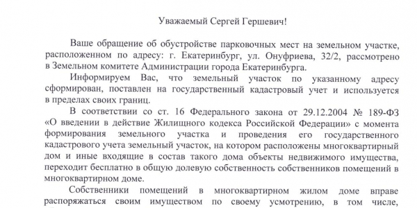 Номер жалобы:26617 Тип жалобы:Прочее Название объекта:Стандарт Регион:Свердловская область Город:Екатеринбург Адрес:ул. Начдива Онуфриева, 32/2 Описание жалобы:Самовольный захват придомовой территории жильцами установлены металлические крабы для Парковки автомобилей подъехать в поликлинике с ребёнком и оставить машину проблематично просьбой демонтировать данные сооружения Статус: