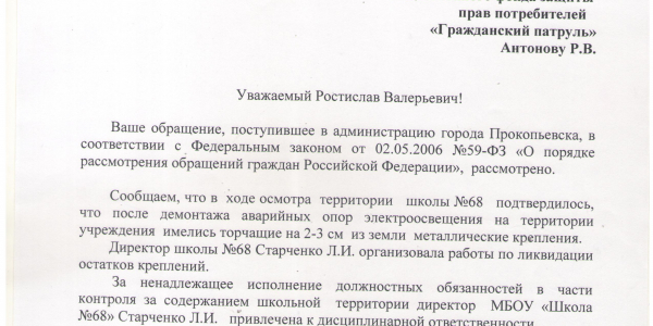 Номер жалобы:26789 Тип жалобы:Прочее Название объекта:- Регион:Кемеровская область Город:Прокопьевск Адрес:ул. Союзная, 59 Описание жалобы:На территории средней общеобразовательной школы #68 остались предположительно остатки опор старого забора. Из которых торчат штыри 3-7 см Статус: