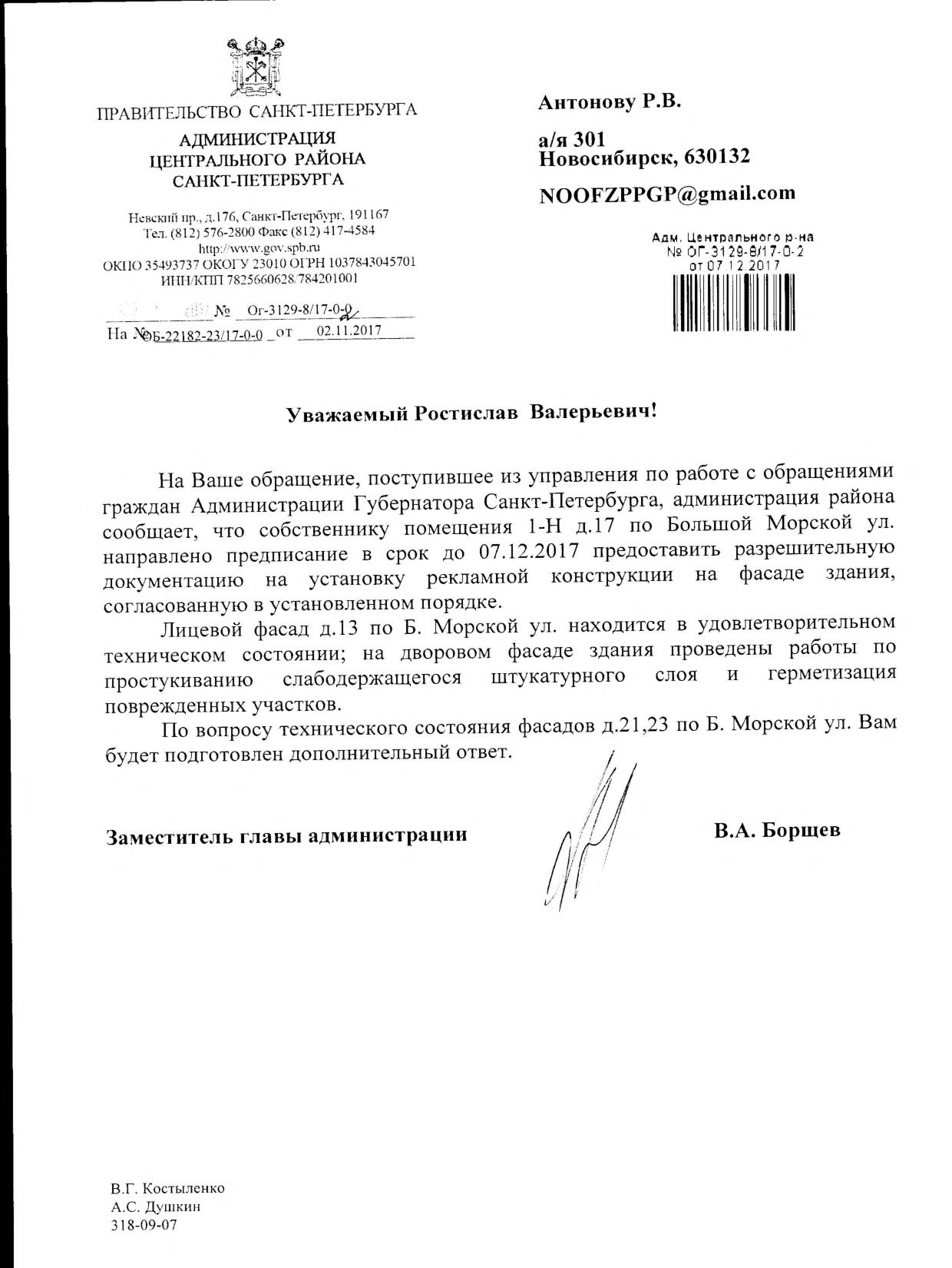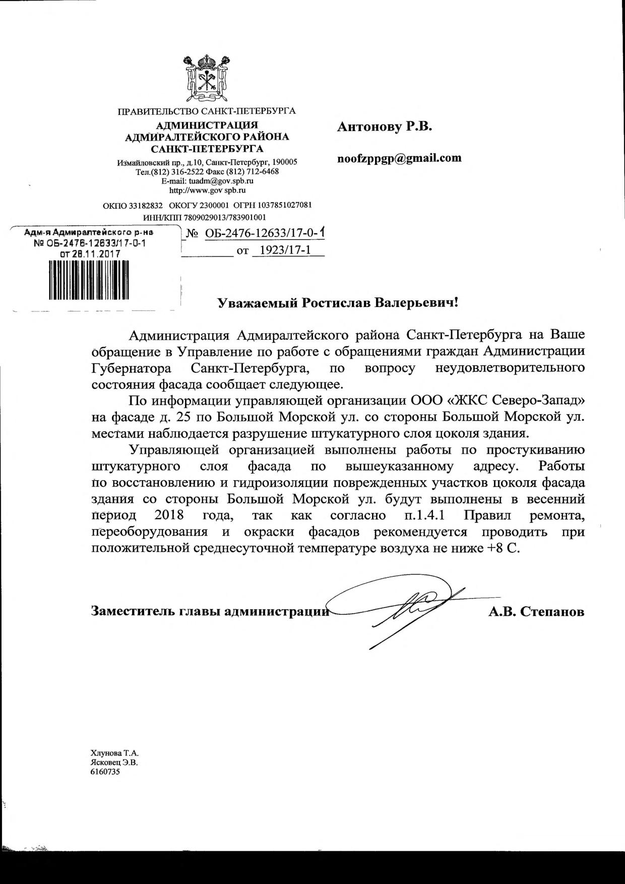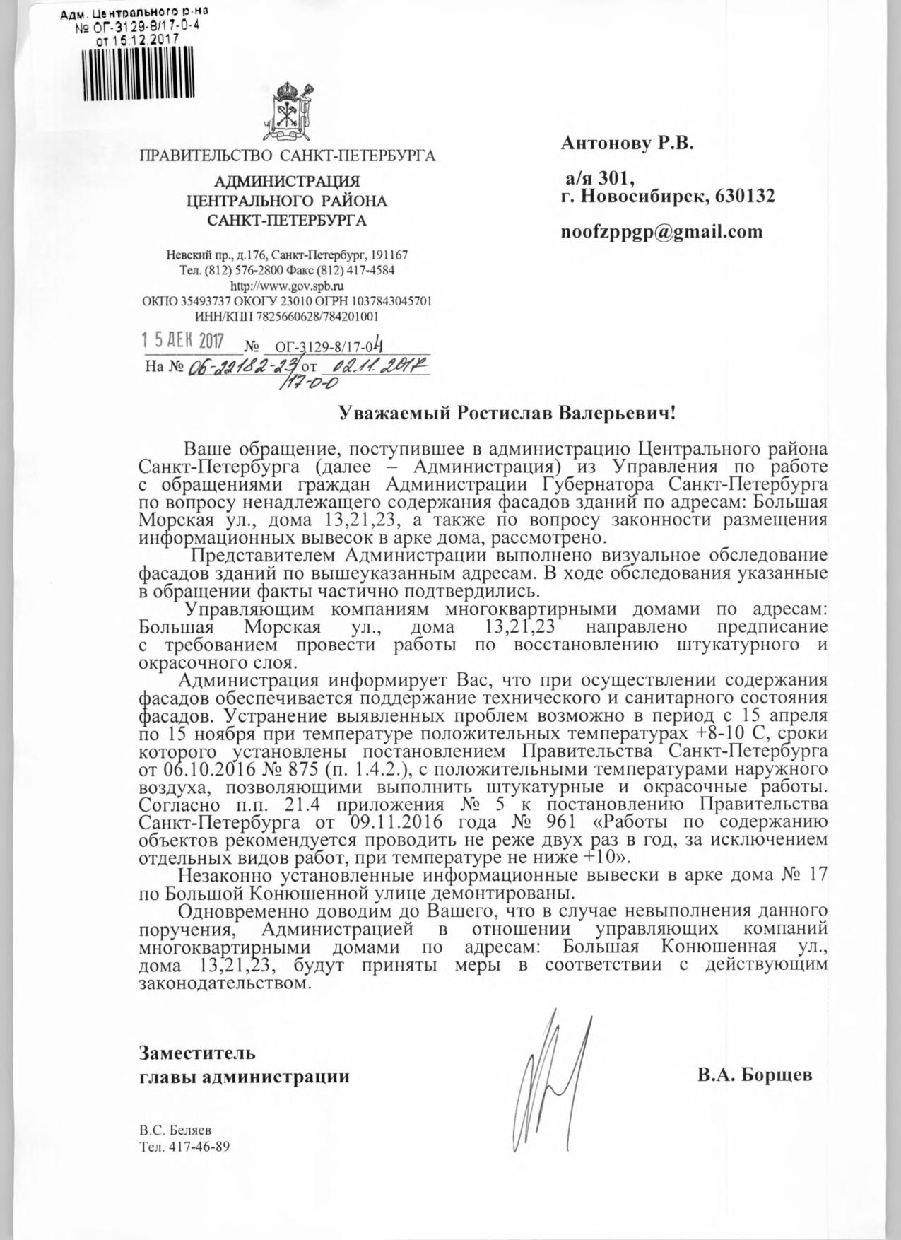 Номер жалобы:26429 Тип жалобы:Прочее Название объекта:Районная Администрация Город:Санкт-Петербург Адрес:Санкт-Петербург, Большая Морская улица, 23 Описание жалобы:Фасад Статус: