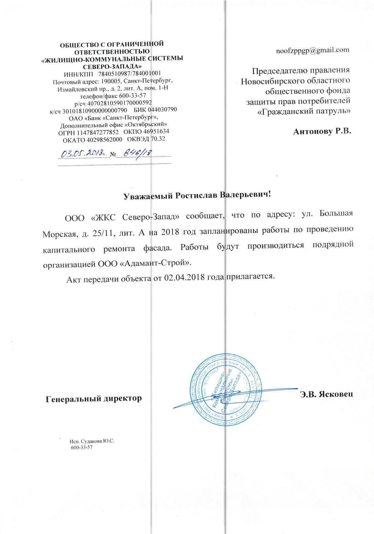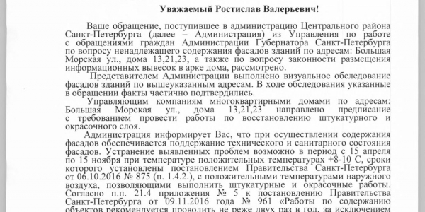 Номер жалобы:26430 Тип жалобы:Прочее Название объекта:Районная Администрация Город:Санкт-Петербург Адрес:Санкт-Петербург, Большая Морская улица, 21 Описание жалобы:Фасад Статус: