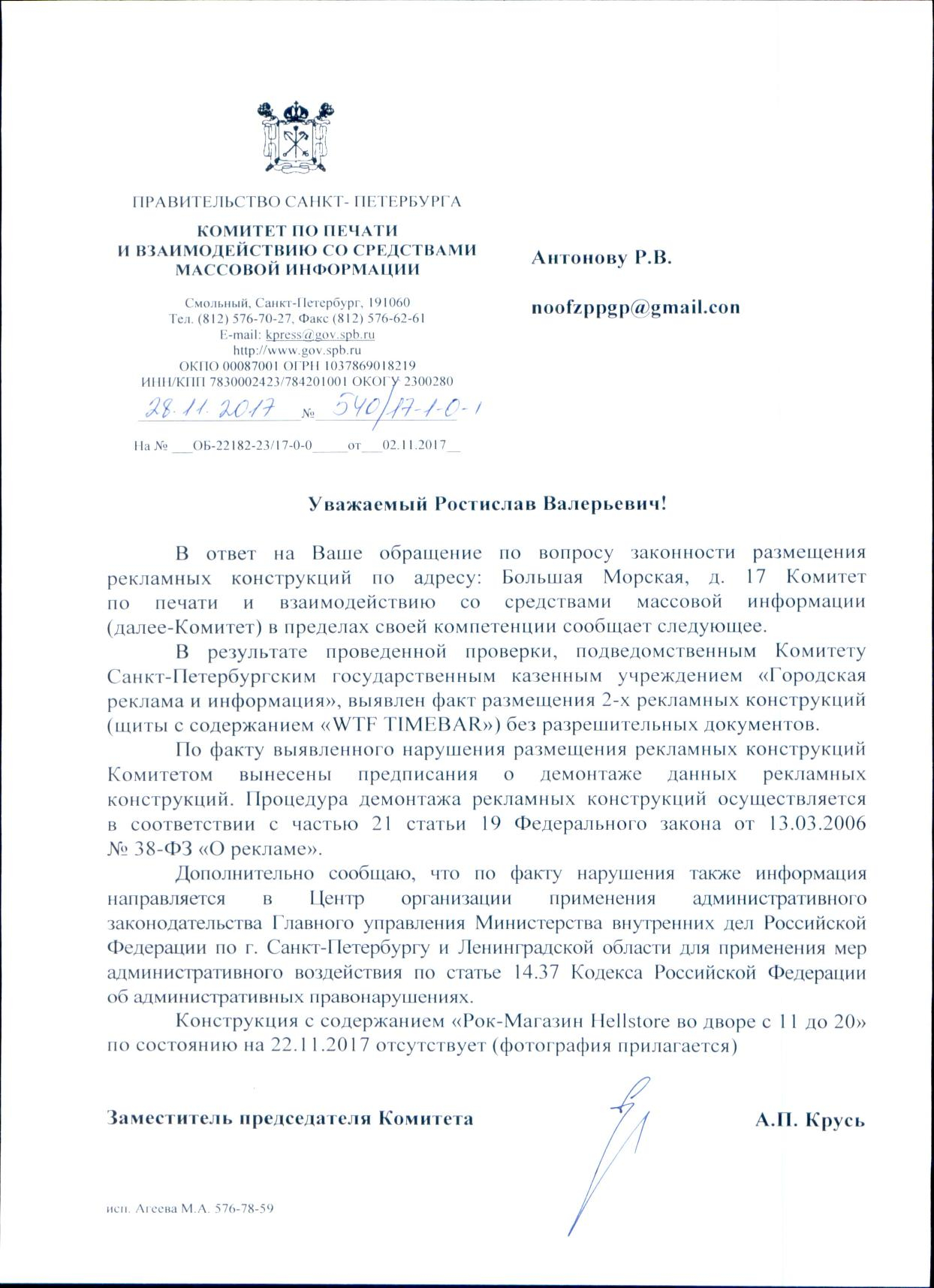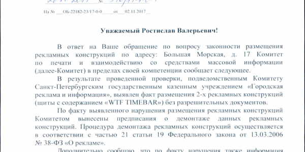 Номер жалобы:26431 Тип жалобы:Прочее Название объекта:Районная Администрация Город:Санкт-Петербург Адрес:Санкт-Петербург, Большая Морская улица, 17 Описание жалобы:Проверить законность рекламы Статус: