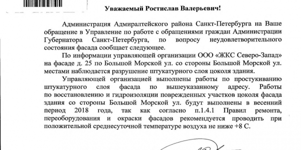 Номер жалобы:26428 Тип жалобы:Прочее Название объекта:Районная Администрация Город:Санкт-Петербург Адрес:Санкт-Петербург, Большая Морская улица, 25 Описание жалобы:Фасад Статус: