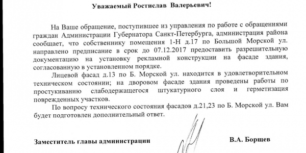 Номер жалобы:26432 Тип жалобы:Прочее Название объекта:Районная Администрация Город:Санкт-Петербург Адрес:Санкт-Петербург, Большая Морская улица, 13 Описание жалобы:Фасад Статус: