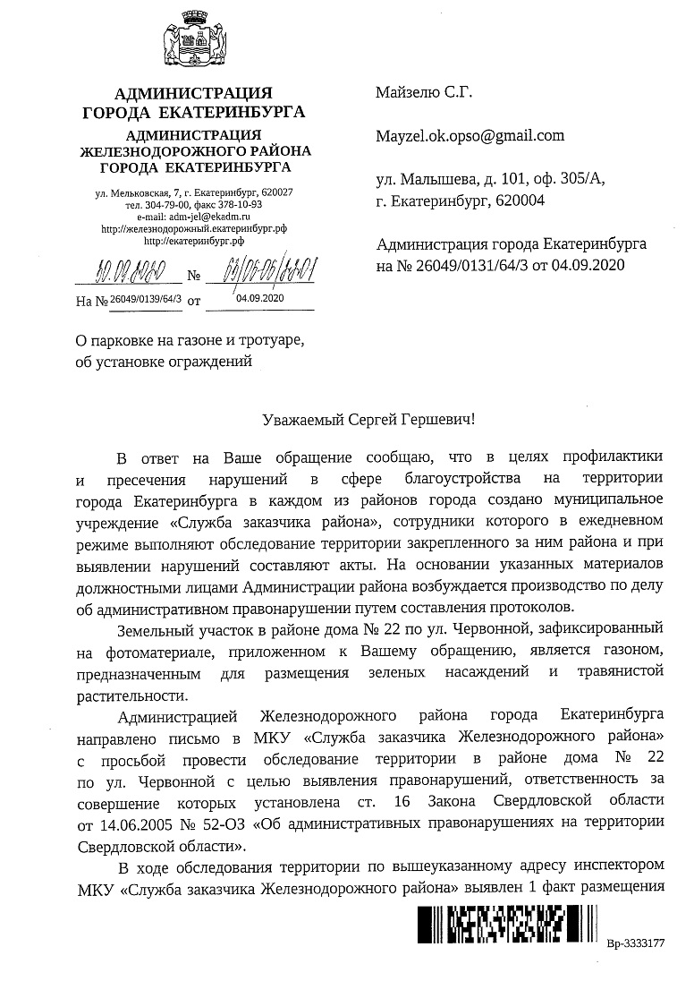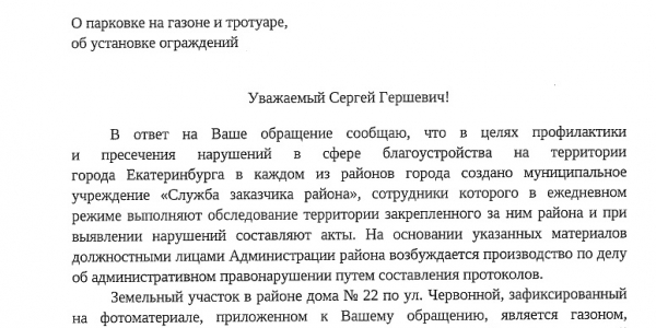 Номер жалобы:68662 Тип жалобы:Прочее Название объекта:мэрия Регион:Свердловская область Город:Екатеринбург Адрес:Червонная улица, 22 Описание жалобы:Стоянка на газоне Статус:
