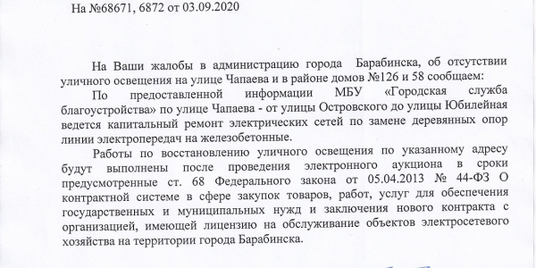 Номер жалобы:68671 Тип жалобы:Прочее Название объекта: Регион:Новосибирская область Город:Барабинск Адрес:улица Чапаева, 58 Описание жалобы:Освещения нет на улице Чапаева. Очень темно передвигаться, а сейчас ещё школа и садики начались. Статус: