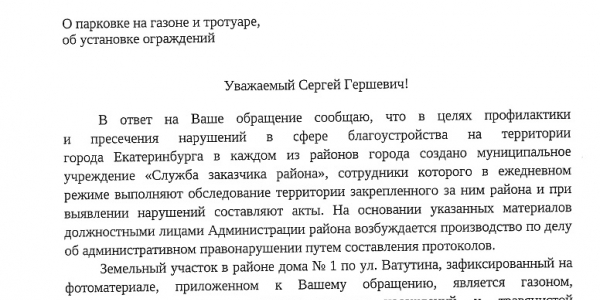 Номер жалобы:68664 Тип жалобы:Прочее Название объекта:мэрия Регион:Свердловская область Город:Екатеринбург Адрес:улица Ватутина, 1 Описание жалобы:Стоянка на газоне. Статус: