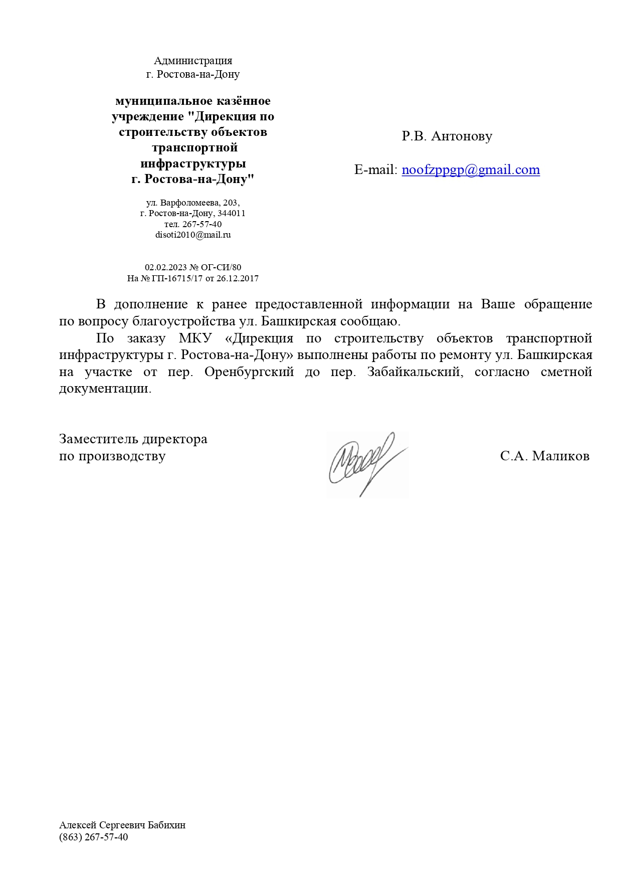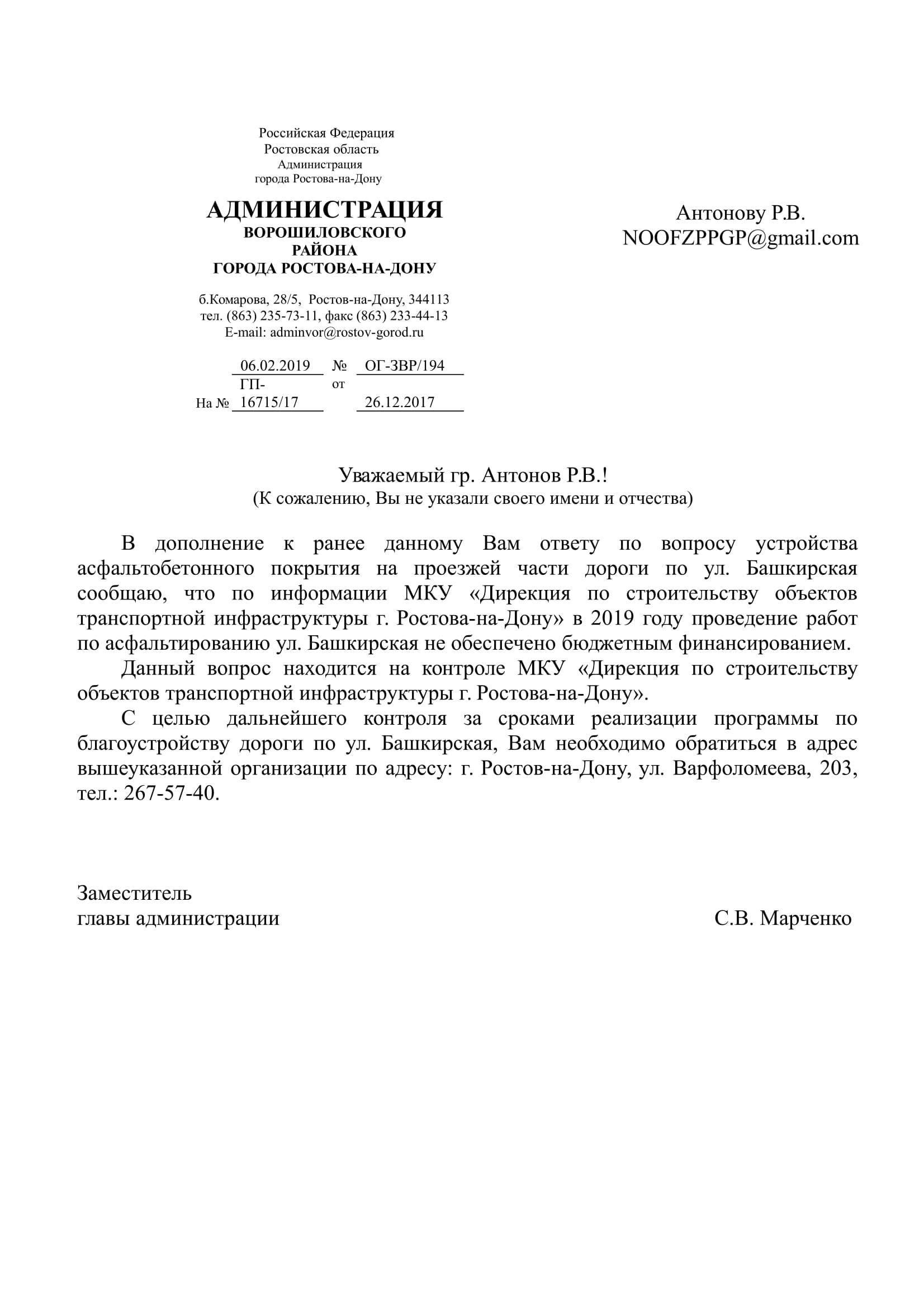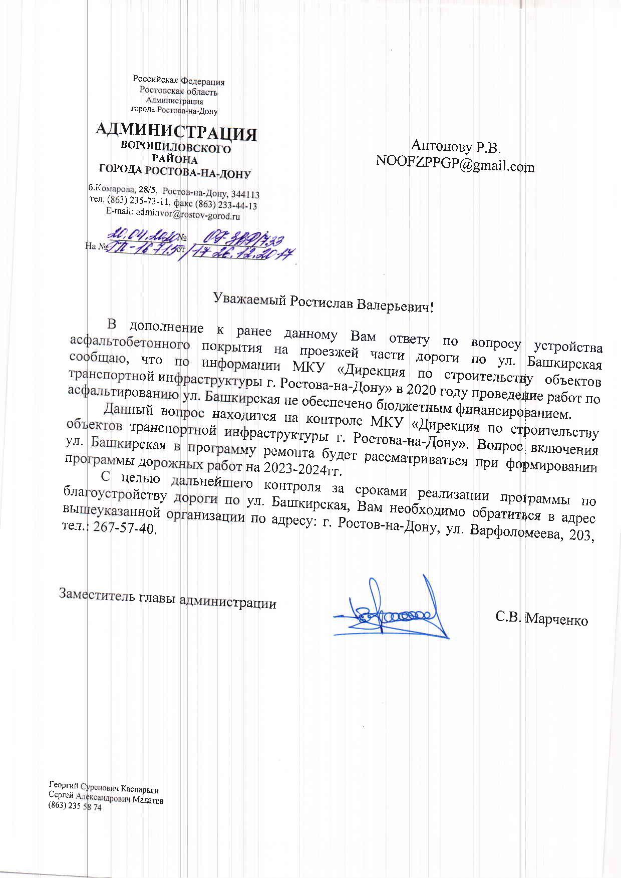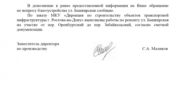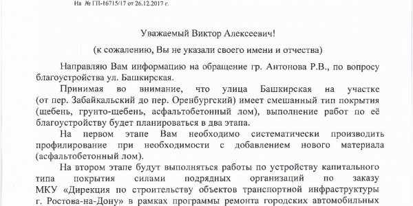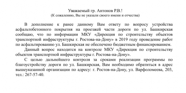 Номер жалобы:28064 Тип жалобы:Ямы во дворе Название объекта:Администрация Ворошиловского Района Регион:Ростовская область Город:Ростов-на-Дону Адрес:Башкирская ул., 10 Описание жалобы:Непроходимая дорога с ямами по улице Башкирская Статус: