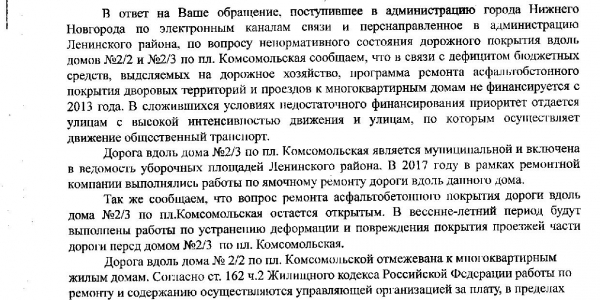 Номер жалобы:29696 Тип жалобы:Ямы во дворе Название объекта:Администрация Ленинского района Регион:Нижегородская область Город:Нижний Новгород Адрес:пл. Комсомольская д.2 корпуса 2-3 Описание жалобы:Ямы во дворе глубиной 20-30 см. При таянии снега их ещ и заливает. Во дворе сплошное болото. Статус: