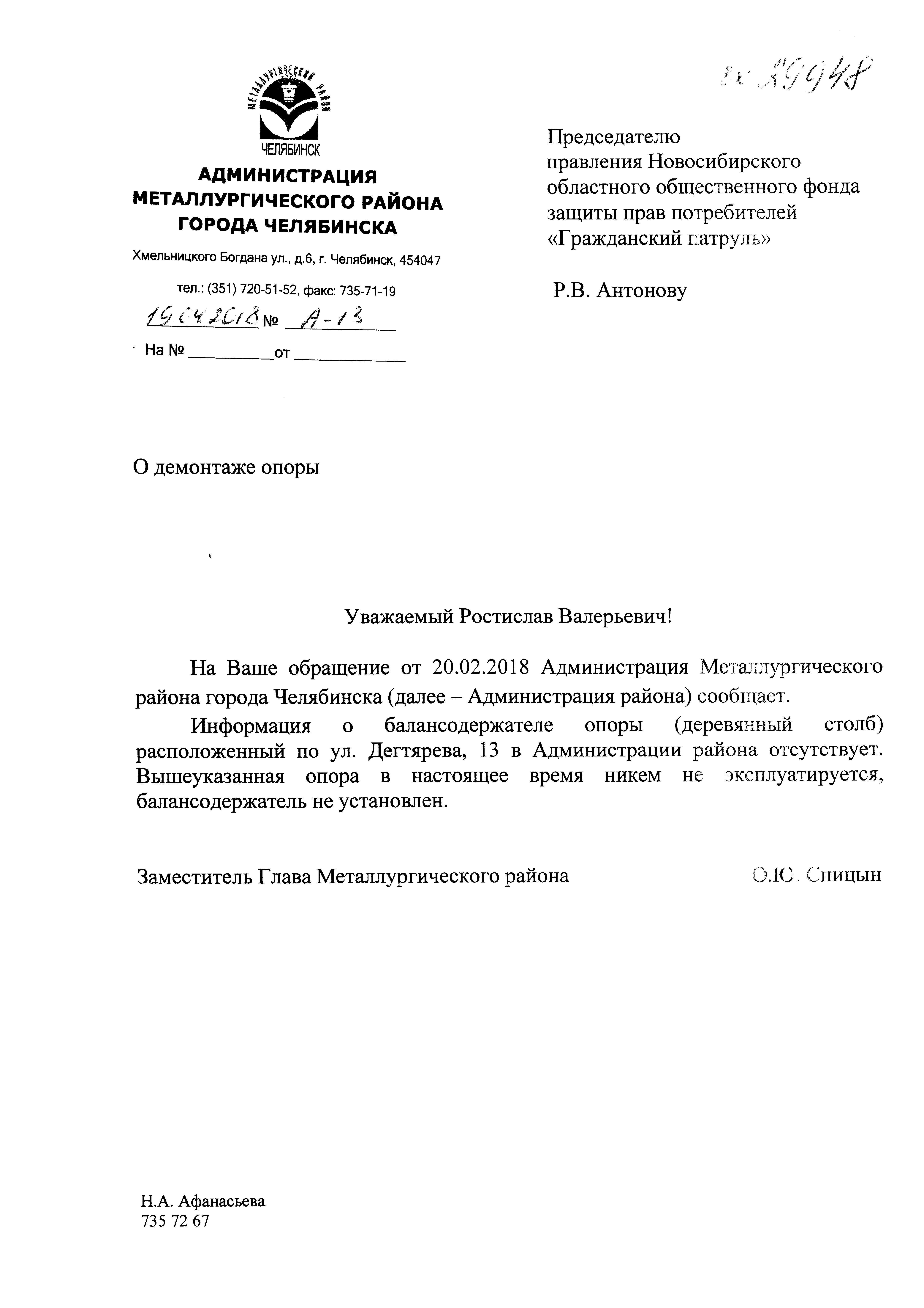 Номер жалобы:29948 Тип жалобы:Иные проблемы ЖКХ Название объекта:Администрация Металлургического Района Регион:Челябинская область Город:Челябинск Адрес:ул. Дегтярева, 13 Описание жалобы:У тротуара на Дегтярева 13 стоит старый деревянный столб ЛЭП,он давно отключен. Требуется демонтаж 359-2 Статус: