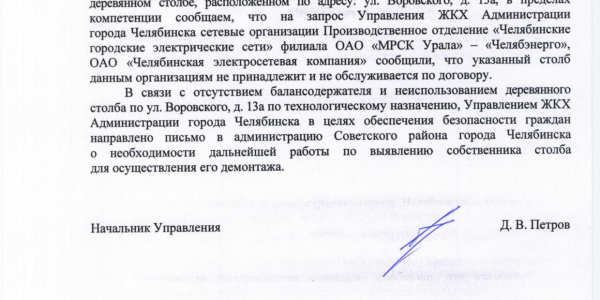 Номер жалобы:29974 Тип жалобы:Иные проблемы ЖКХ Название объекта:Администрация Советского района Регион:Челябинская область Город:Челябинск Адрес:ул. Воровского, 13А Описание жалобы:Во дворе по Воровского 13а стоит деревянная опора ЛЭП, давно неиспользуемая. По ней поднимается старый кабель, ничем не защищенный,который может являться угрозой для детей. Требуется демонтаж опоры. Статус: