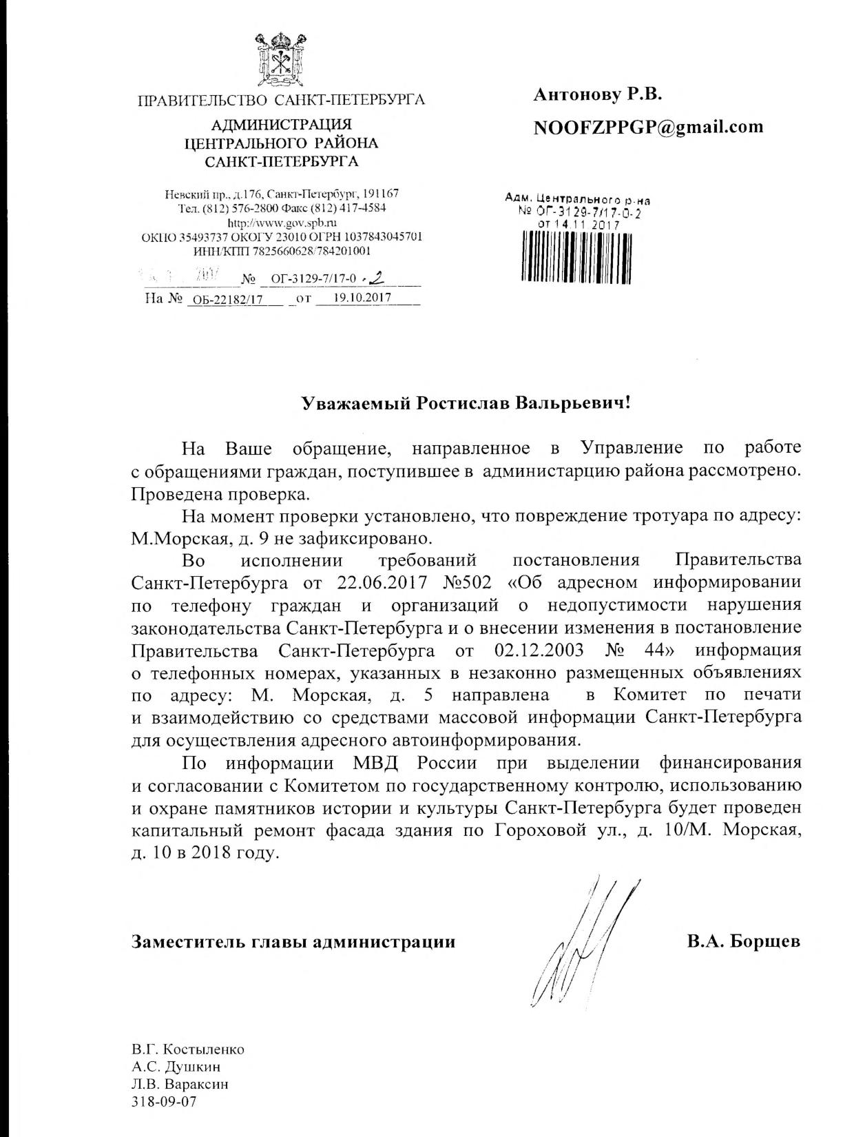 Номер жалобы:25930 Тип жалобы:Прочее Название объекта:Администрация Город:Санкт-Петербург Адрес:Санкт-Петербург, Малая Морская улица, 5 Описание жалобы:Незаконная реклама Статус: