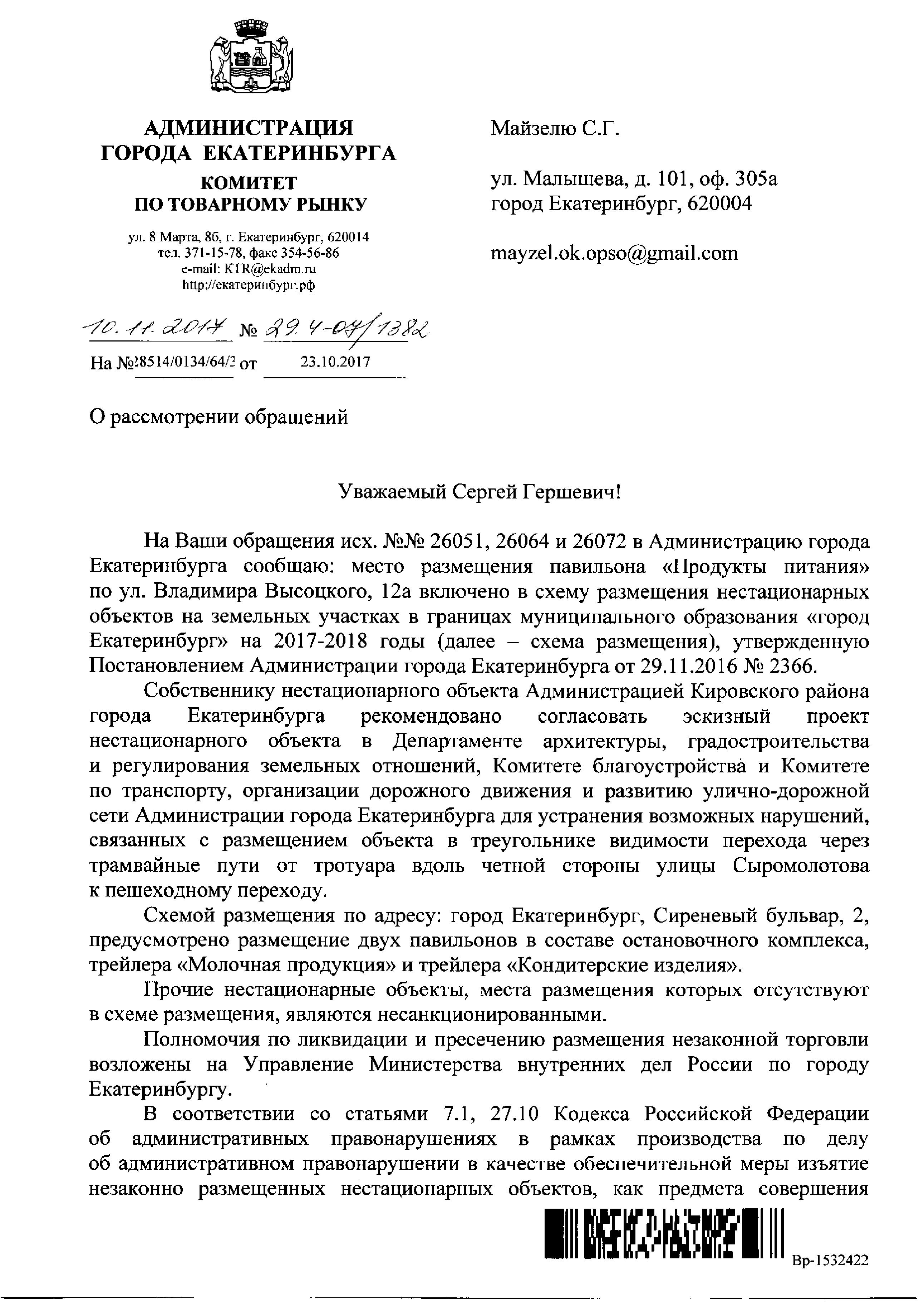 Номер жалобы:26051 Тип жалобы:Прочее Название объекта:Администрация Екатеринбурга Регион:Свердловская область Город:Екатеринбург Адрес:Сиреневый бульвар, 1 Описание жалобы:Несогласованные киоски на перекрёстке Сыромолотова и Сиреневого бульвара со стороны Сиреневого бульвара, 1. Статус: