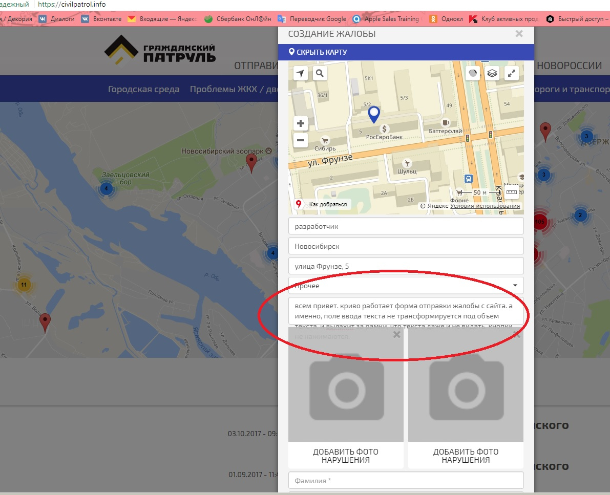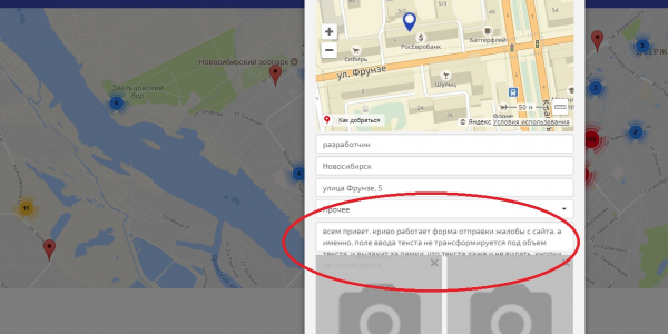 Номер жалобы:26101 Тип жалобы:Прочее Название объекта:разработчик Регион:Новосибирская область Город:Новосибирск Адрес:улица Фрунзе, 5 Описание жалобы:всем привет. криво работает форма отправки жалобы с сайта. а именно, поле ввода текста не трансформируется под объем текста, и вылахит за рамки, что текста даже и не видать. кнопки не нажимаются. Статус: