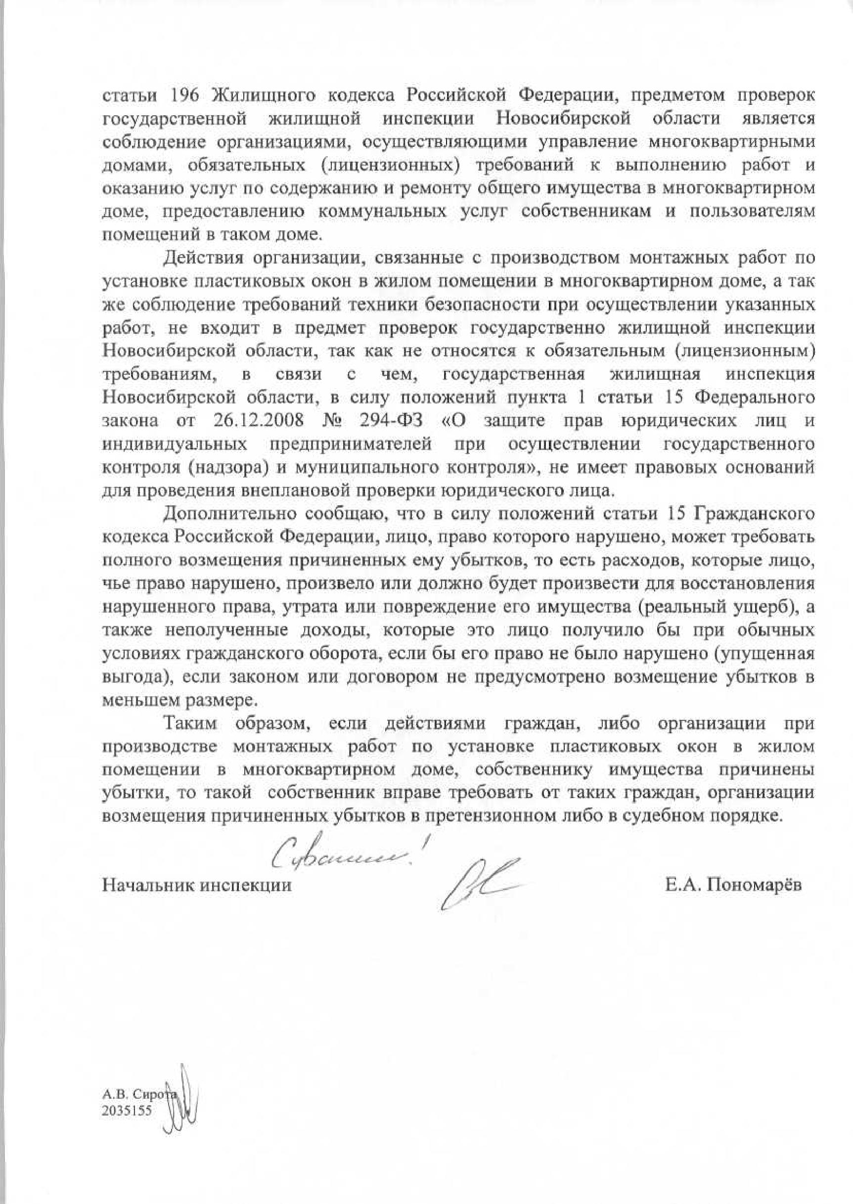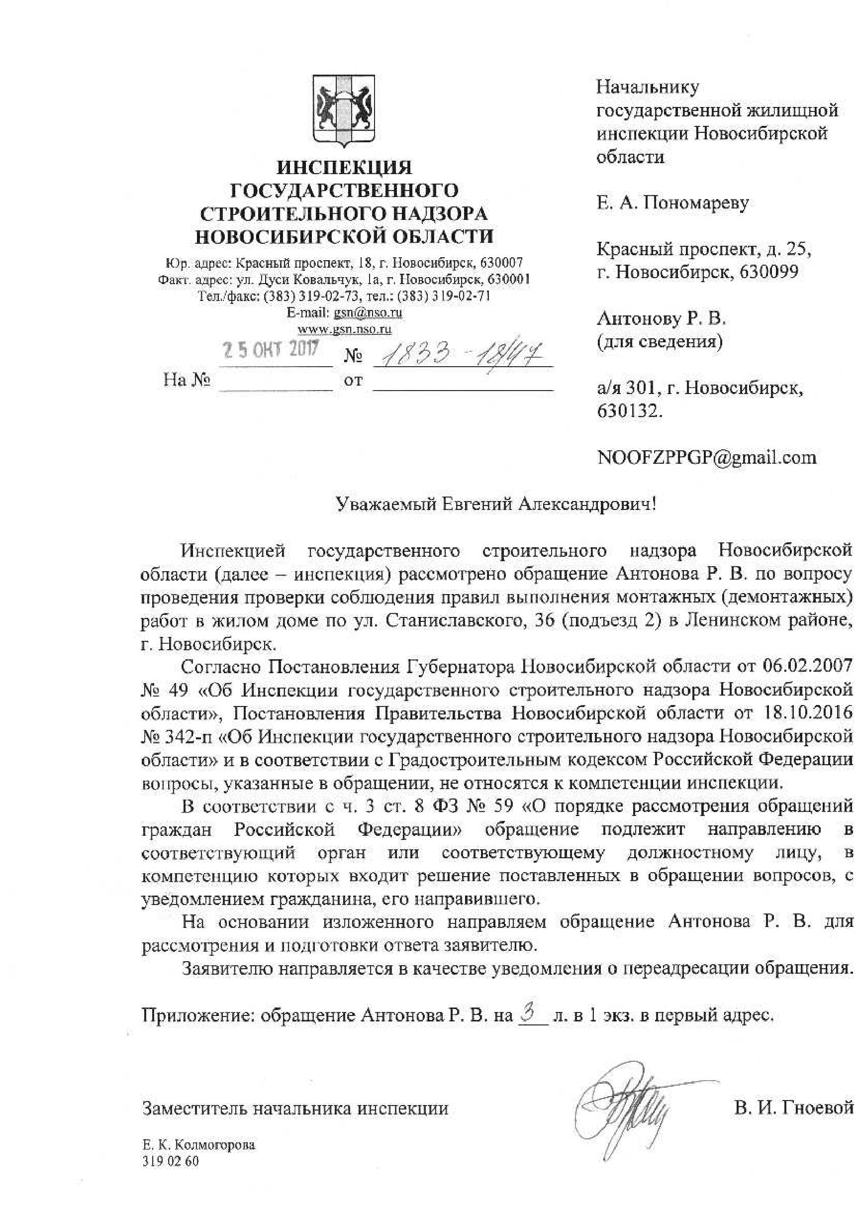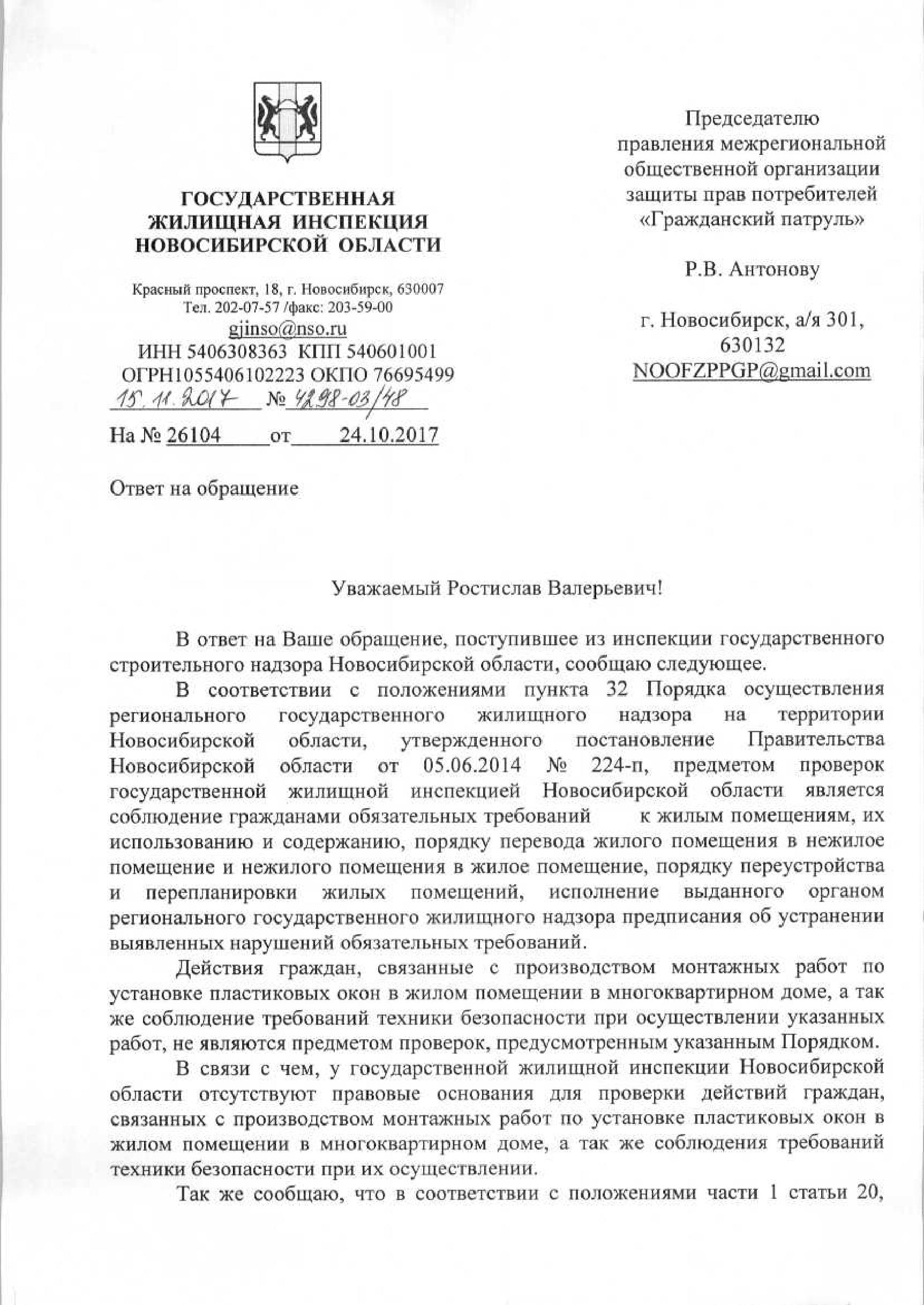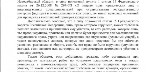 Номер жалобы:26104 Тип жалобы:Прочее Название объекта:Не Установлены Регион:Новосибирская область Город:Новосибирск Адрес:ул. Станиславского, 36 Описание жалобы:Выполнение высотных монтажных работ с нарушением техники безопасности. При демонтаже с 7 этажа дома по ул. Станиславского 36, подъезд 2, упала на проезжую часть рядом с личным автомобилем металлическая балка. Жертв нет, повреждений авто нет. При замечании рабочим: "-а если на машину упадёт?!" они отреагировали "ну не попало же" и продолжили работы. Двери в квартиру хозяин не открыл для беседы. Предположительно квартира 63. Предлагаю установить фирму, и лиц производивших монтаж (демонтаж) пластиковых окон и привлечь к ответственности. Статус: