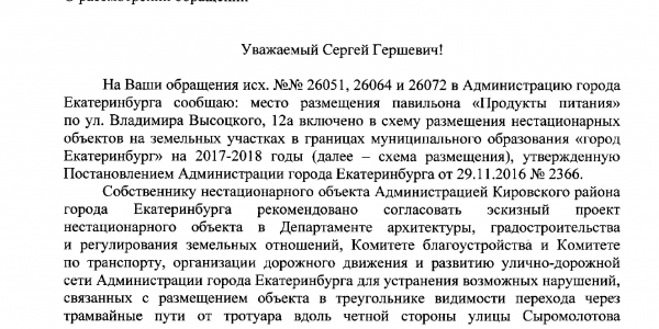 Номер жалобы:26064 Тип жалобы:Прочее Название объекта:Администрация Екатеринбурга Регион:Свердловская область Город:Екатеринбург Адрес:Высоцкого, 12а Описание жалобы:Киоск «Продукты Ермолино» установлен в треугольнике видимости перехода через трамвайные пути от тротуара вдоль чётной стороны Сыромолотова к пешеходному переходу через Сыромолотова. Статус: