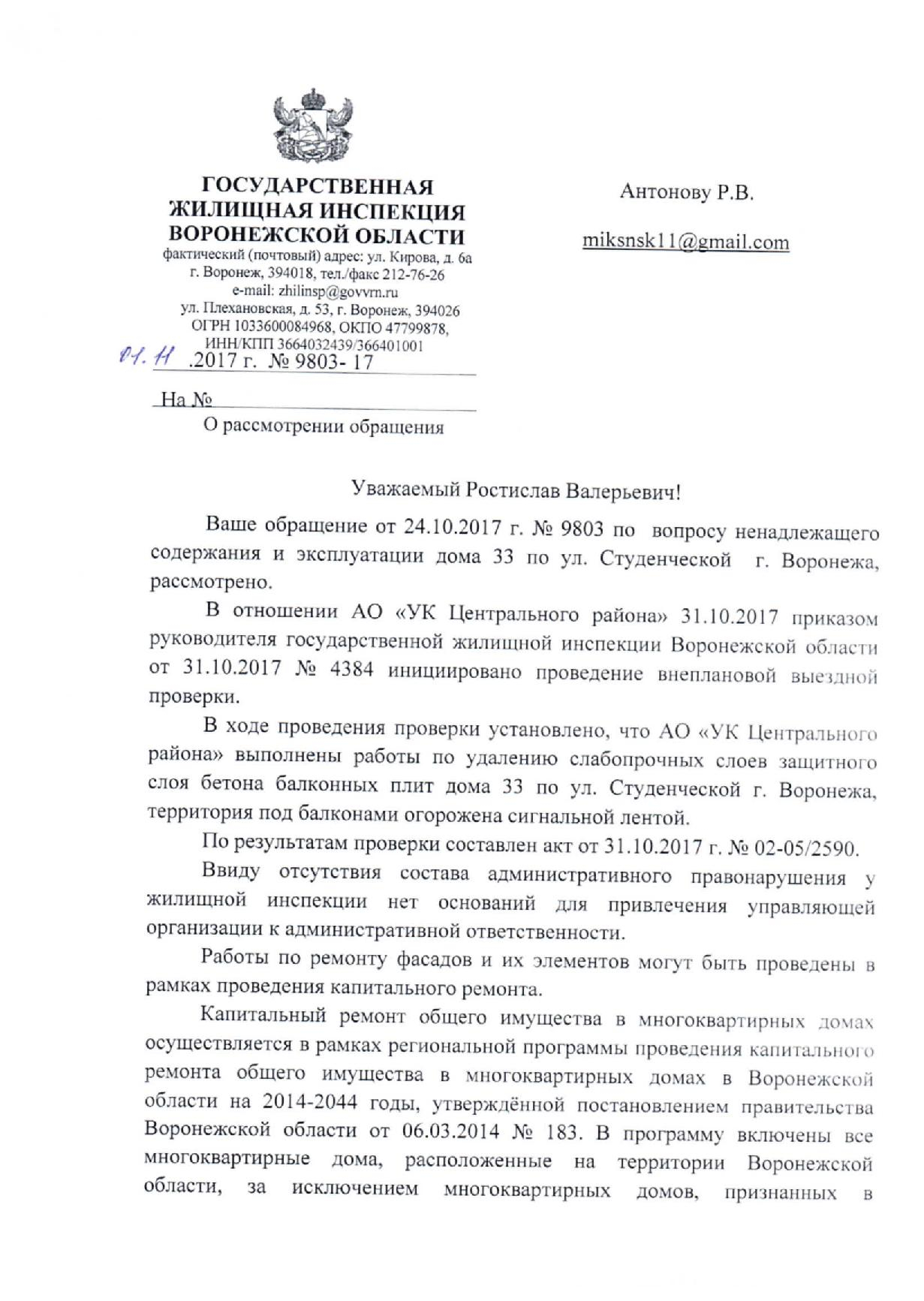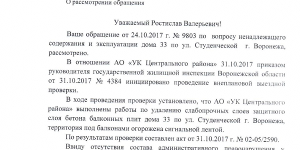 Номер жалобы:25872 Тип жалобы:Прочее Название объекта:УК Регион:Воронежская область Город:Воронеж Адрес:Студенческая ул., 33 Описание жалобы:Аварийные балконы прямо под тротуаром, который довольно узок , обойти затруднительно : рядом парковка машин и сразу проезжая часть. Рядом банк и школа, очень опасное место. Статус: