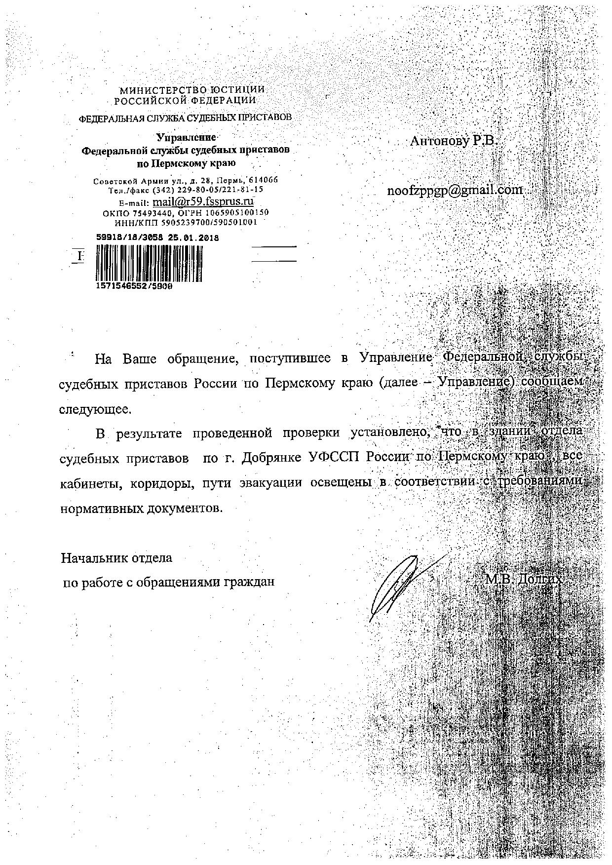 Номер жалобы:25897 Тип жалобы:Прочее Название объекта:Отдел судебных приставов по г. Добрянке УФССП России по Пермскому краю Регион:Пермский край Город:Добрянка Адрес:ул. Советская, 43 Описание жалобы:Я, Болотов Михаил Анатольевич, гражданин РФ, житель г. Добрянки 16 августа 2017 года 13 ч 37 мин (время пермское) посетил здание отдела судебных приставов по городу Добрянка УФССП России по Пермскому краю, ул. Советская 43. Во время мониторинга были обнаружены следующие нарушения, отсутствует освещение в соответствии с нормам и санитарного врача РФ от 8 апреля 2003 г. N 34 "О введении в действие СанПиН 2.2.1/2.1.1.1278-03""Гигиенические требования к естественному, искусственному и совмещенному освещению жилых и общественных зданий"