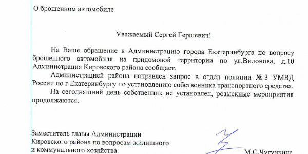 Номер жалобы:25893 Тип жалобы:Прочее Название объекта:Брошенное авто на Вилонова, 10 Регион:Свердловская область Город:Екатеринбург Адрес:ул. Вилонова, 10 Описание жалобы:Во дворе дома N10 по улице Вилонова уже несколько недель стоит брошенный автомобиль марки ВАЗ красного цвета. Номерные знаки отсутствуют. Необходимо организовать вывоз этого автомобиля из двора. Статус: