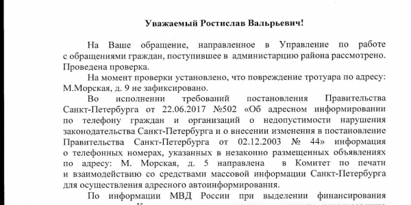 Номер жалобы:25929 Тип жалобы:Прочее Название объекта:Администрация Город:Санкт-Петербург Адрес:Санкт-Петербург, Малая Морская улица, 9 Описание жалобы:Комментарий Статус: