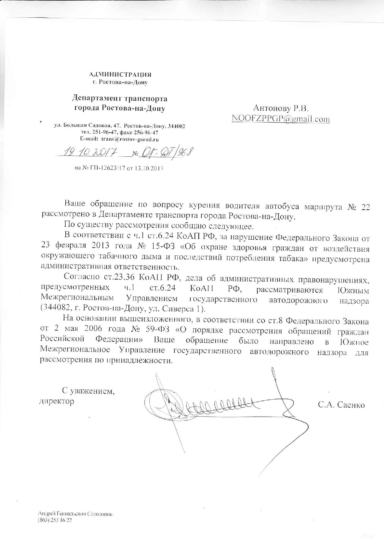 Номер жалобы:25782 Тип жалобы:Прочее Название объекта:Департамент транспорта г.Ростов-на-Дону Регион:Ростовская область Город:Ростов-на-Дону Адрес:По маршруту Описание жалобы: 01.10.2017 19:30 Место совершения нарушения Ехала с Гвардейской площади до северного Ашана 23-го сентября 2017 года. В промежуток времени приблизительно 18.30-19.30. За всю поездку дважды пришлось просить водителя прекратить курение.
