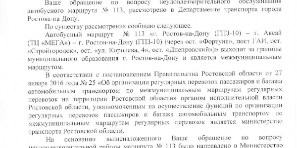 Номер жалобы:25784 Тип жалобы:Прочее Название объекта:Департамент транспорта г.Ростов-на-Дону Город:Ростов-на-Дону Адрес:Ост. Изыскательский Описание жалобы: 02.10.2017 11:47 Маршрутное такси № 113