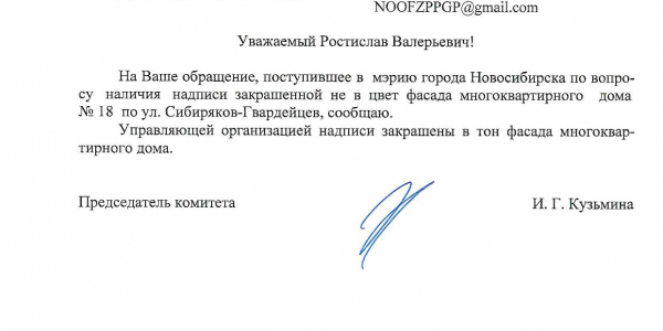 Номер жалобы:29653 Тип жалобы:Иные проблемы ЖКХ Название объекта:Управляющая Компания Город:Новосибирск Адрес:Новосибирск, улица Сибиряков-Гвардейцев, 22 Описание жалобы:Фасад дома разрисован Статус: