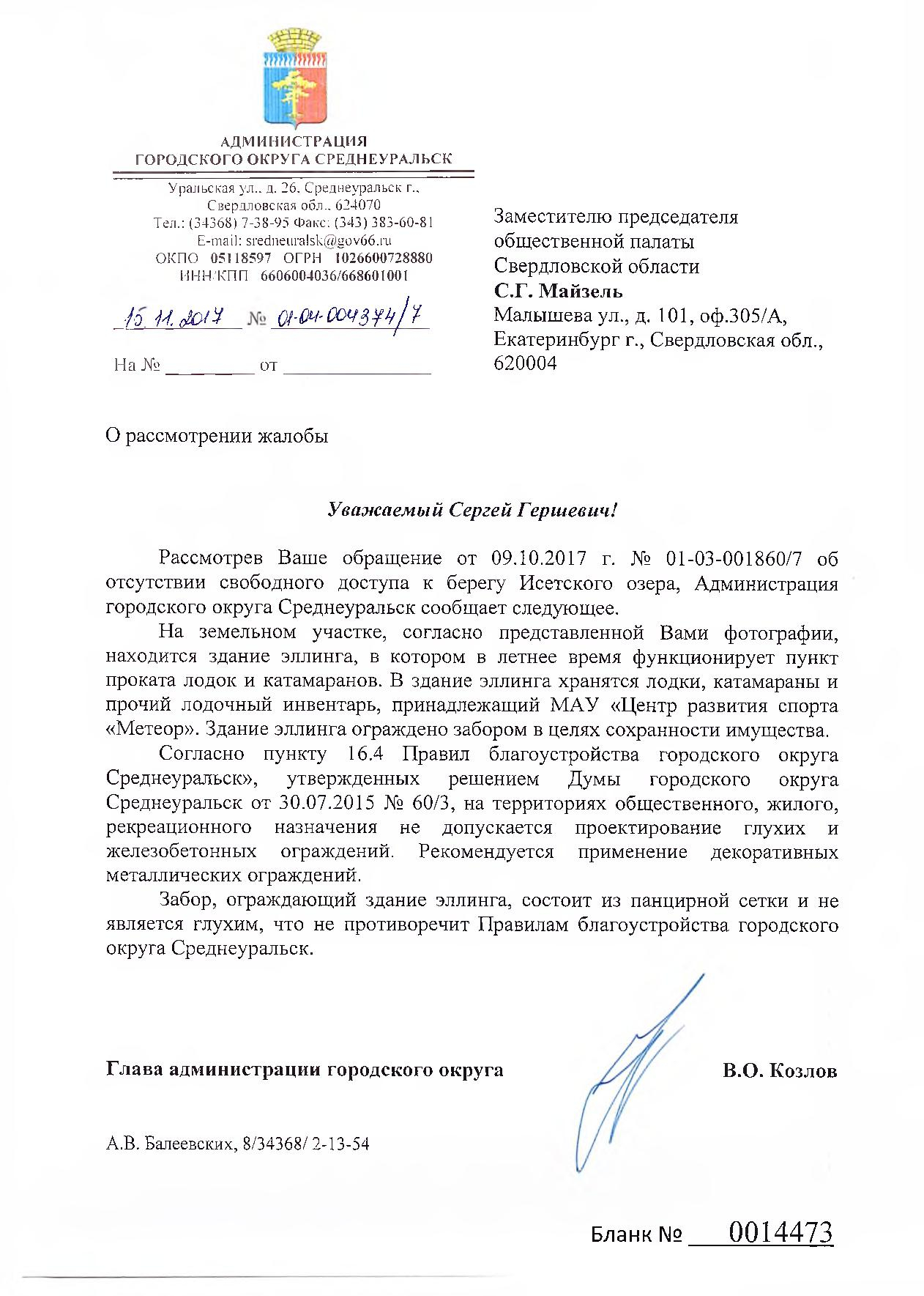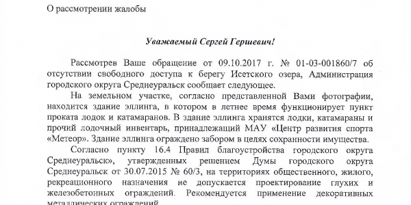 Номер жалобы:25536 Тип жалобы:Прочее Название объекта:Министерство природных ресурсов Регион:Свердловская область Город:Среднеуральск Адрес:обл. Свердловская, г. Среднеуральск, ул. Набережная - Школьников Описание жалобы:Отсутствует свободный доступ к берегу Исетского озера на территории лодочной станции. Статус: