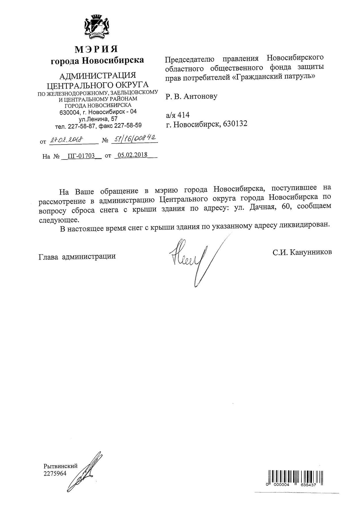 Номер жалобы:29481 Тип жалобы:Иные проблемы ЖКХ Название объекта:Управляющая Компания Регион:Новосибирская область Город:Новосибирск Адрес:ул. Дачная, 27 Описание жалобы:Снег на крыше дома Статус: