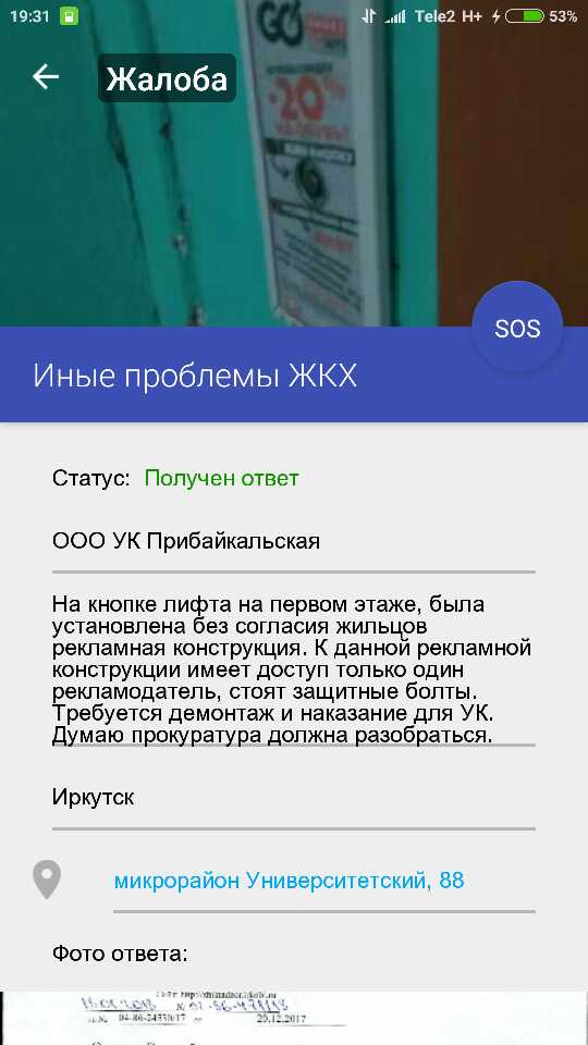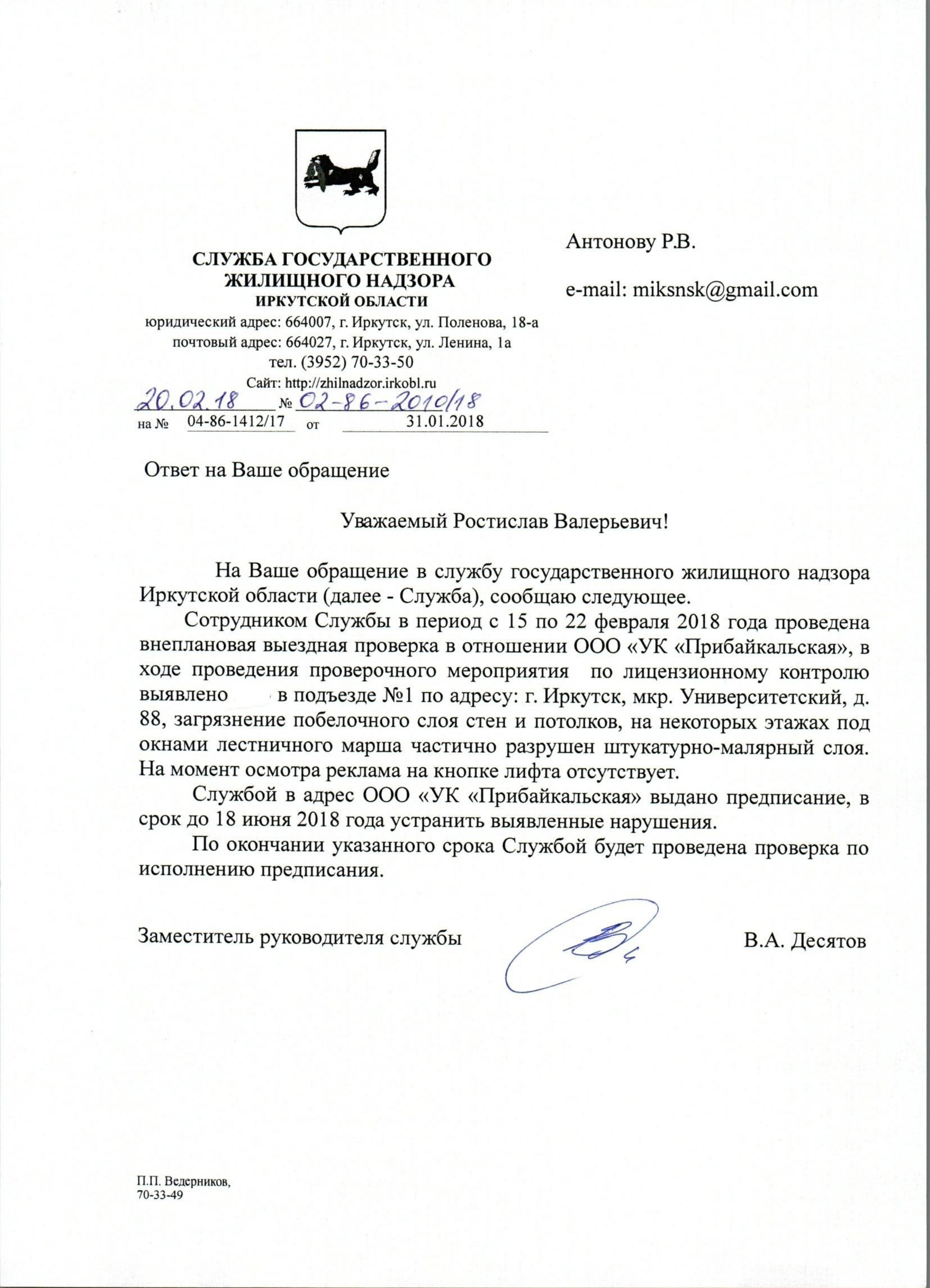 Номер жалобы:29129 Тип жалобы:Иные проблемы ЖКХ Название объекта:УК Регион:Иркутская область Город:Иркутск Адрес:микрорайон Университетский, 88 Описание жалобы:Был дан ответ по жалобе: 27893. ГЖИ провела проверку в подъезде #2 , однако данная реклама расположена по адресу: микрорайон Университетский 88 подъезд 1. Прошу направить повторно для повторной проверки.
