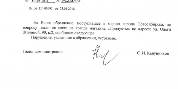 Номер жалобы:29071 Тип жалобы:Иные проблемы ЖКХ Название объекта:Администрация Регион:Новосибирская область Город:Новосибирск Адрес:ул. Ольги Жилиной, 90 Описание жалобы:Ольги Жилиной 90 корпус 2, снег на крыше магазина Статус:
