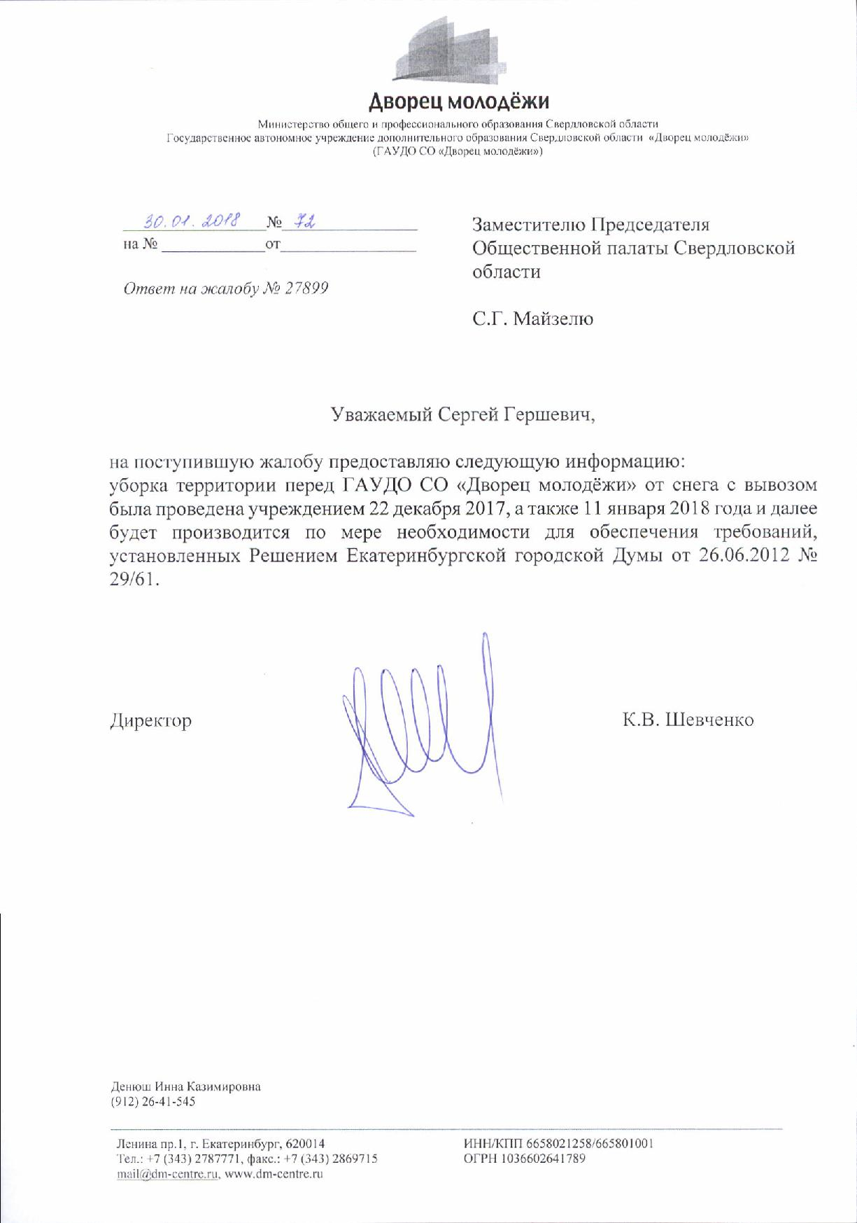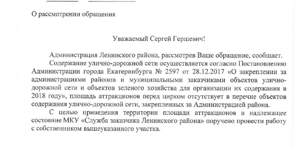 Номер жалобы:27898 Тип жалобы:Качество уборки снега на тротуарах Название объекта:Екатеринбургский Государственный Цирк Регион:Свердловская область Город:Екатеринбург Адрес:8 Марта, 43 Описание жалобы:Отсутствует уборка снега на площади с аттракционами перед цирком. Статус: