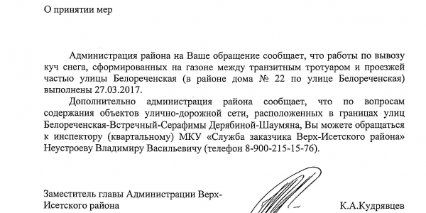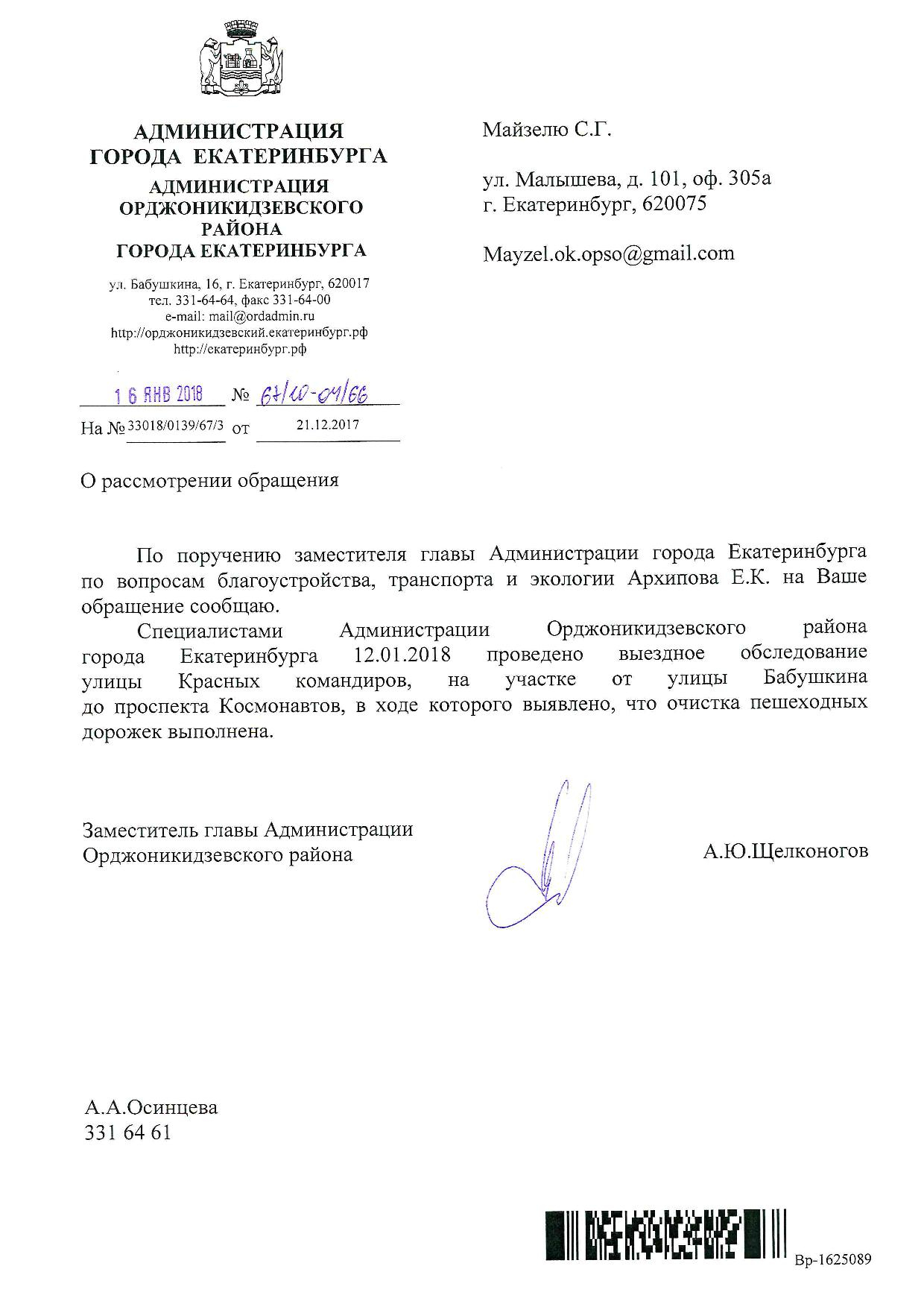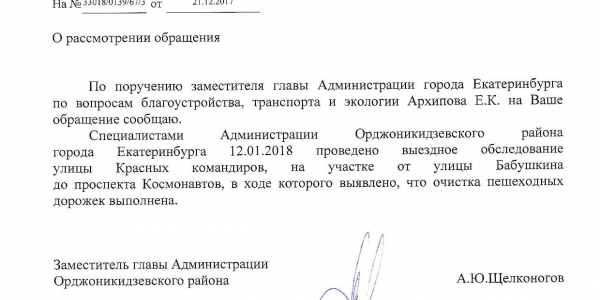 Номер жалобы:27952 Тип жалобы:Качество уборки снега на тротуарах Название объекта:Администрация Екатеринбурга Регион:Свердловская область Город:Екатеринбург Адрес:Бабушкина, 45А, Красных Командиров, 2 Описание жалобы:Отсутствует уборка снега на тротуаре в районе дома 45а по улице Бабушкина, на въездах во двор по обеим сторонам дома и на тротуаре к пешеходному переходу через Космонавтов от дома Красных Командиров, 2. Статус: