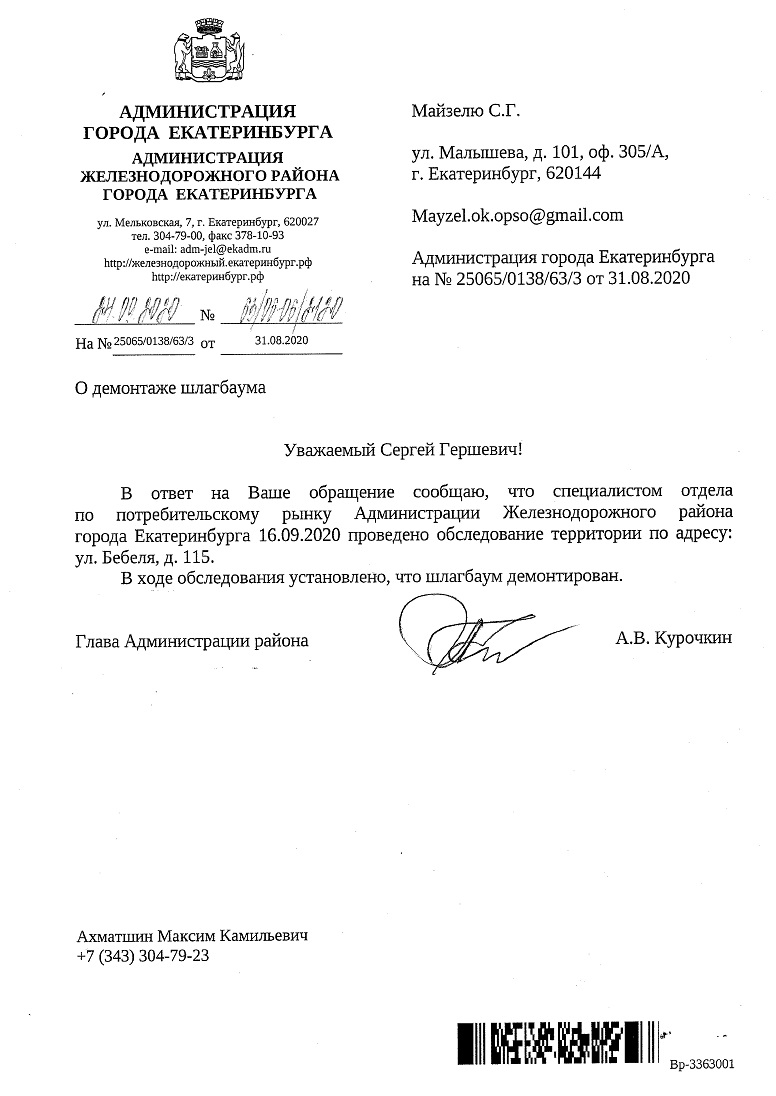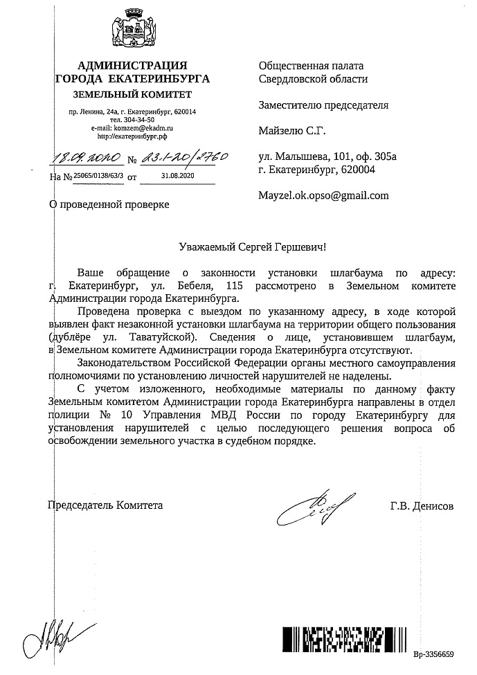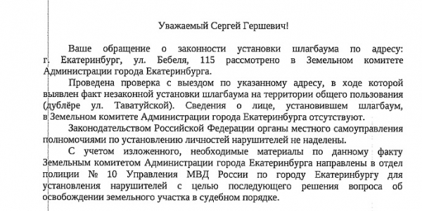 Номер жалобы:68514 Тип жалобы:Прочее Название объекта:мэрия Регион:Свердловская область Город:Екатеринбург Адрес:улица Бебеля, 115 Описание жалобы:На дублёре улицы Таватуйской незаконно установлен шлагбаум. Статус: