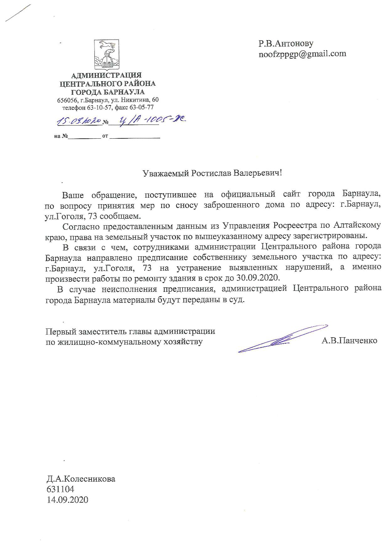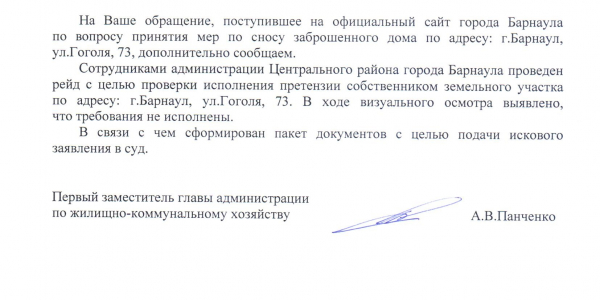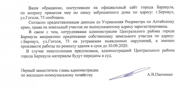 Номер жалобы:68526 Тип жалобы:Прочее Название объекта: Регион:Алтайский край Город:Барнаул Адрес:улица Гоголя, 73 Описание жалобы:Заброшенный деревянный дом.Может произойти обрушение стены на тротуар, где ходят люди. Статус: