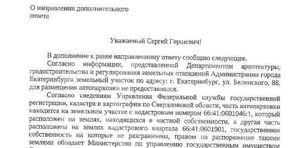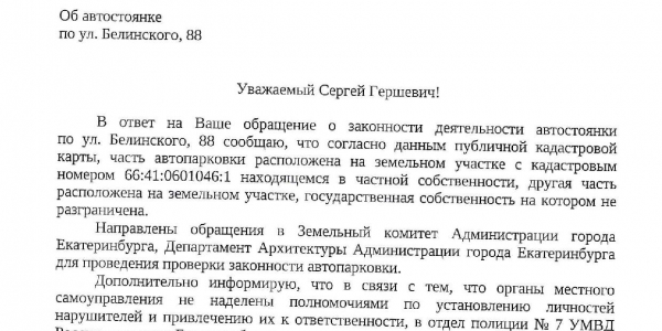 Номер жалобы:68489 Тип жалобы:Прочее Название объекта: Регион:Свердловская область Город:Екатеринбург Адрес:улица Белинского, 88 Описание жалобы:Часть латной парковки около Церкви Святого Карапетян ( Белинского 88) находится на Муниципальной земле. Доступ на парковку перекрыт шлагбаумом. Прошу проверить законность их действий Статус: