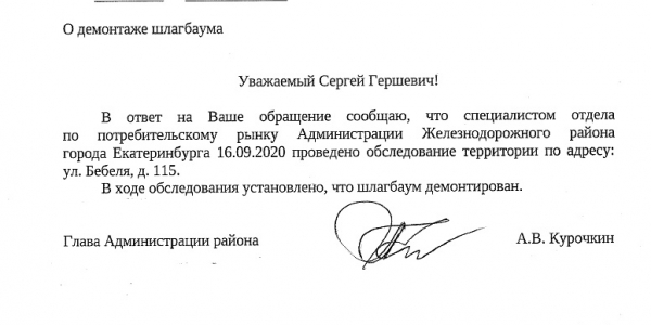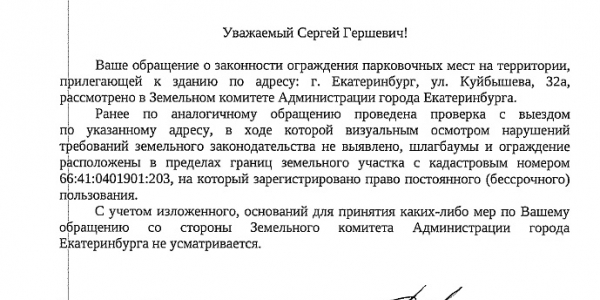 Номер жалобы:68504 Тип жалобы:Прочее Название объекта: Регион:Свердловская область Город:Екатеринбург Адрес:улица Куйбышева, 32Ас2 Описание жалобы:Въезд на парковку на муниципальной земле около стадиона Юность ограничен шлагбаумом. По периметру парковка огорожена забором. Прошу разобраться в ситуации и демонтировать шлагбаум и заборы. Статус: