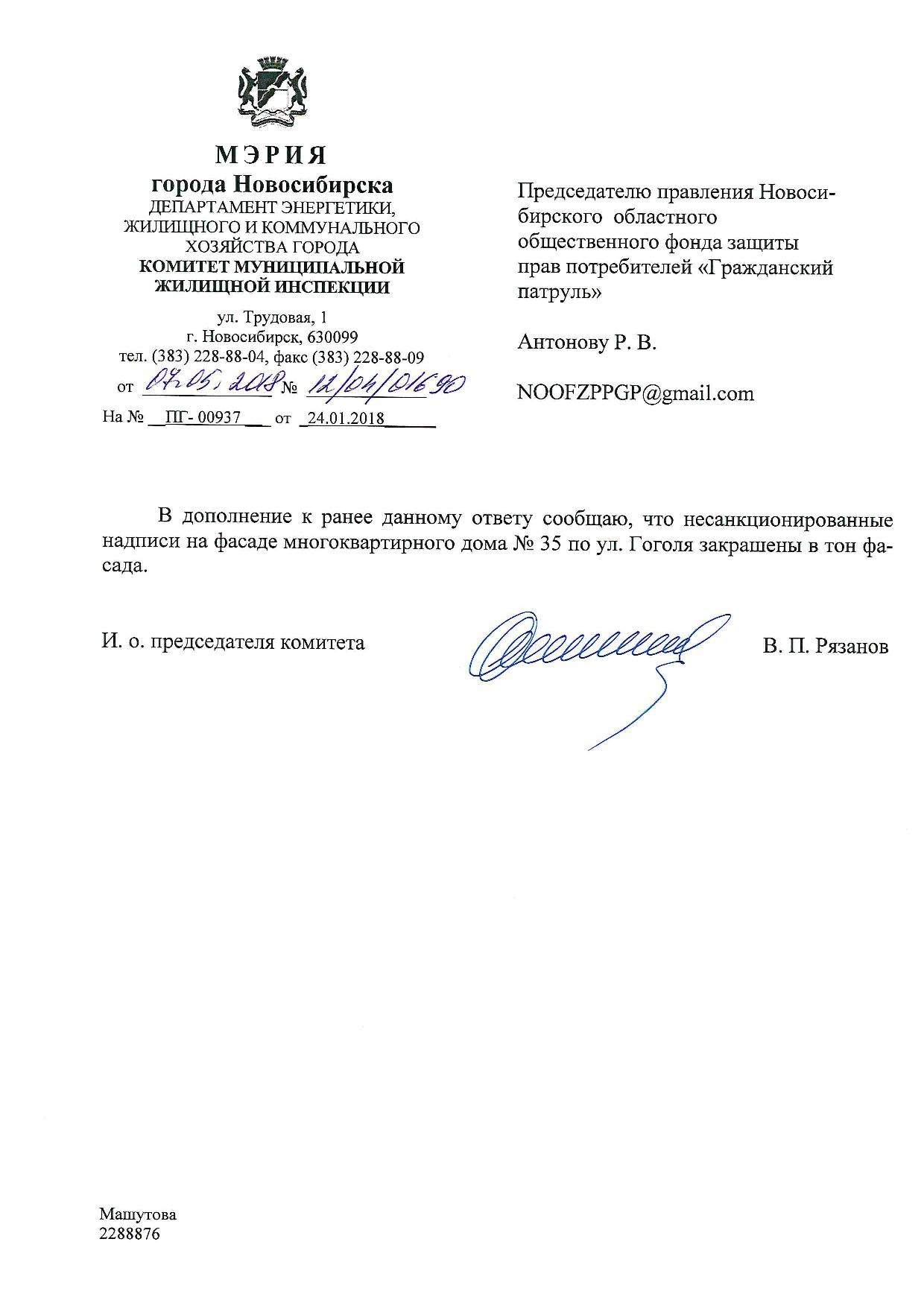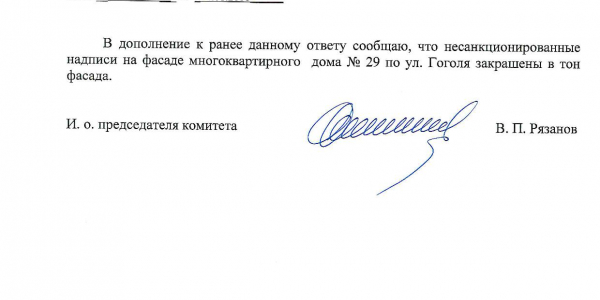 Номер жалобы:29023 Тип жалобы:Иные проблемы ЖКХ Название объекта:Управляющая Компания Регион:Новосибирская область Город:Новосибирск Адрес:ул. Гоголя, 35 Описание жалобы:Не в то закрашенные надписи Статус: