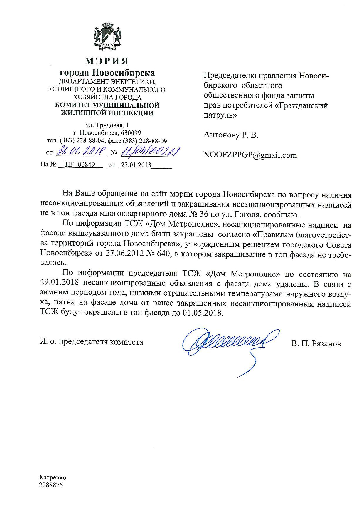 Номер жалобы:28937 Тип жалобы:Иные проблемы ЖКХ Название объекта:Управляющая Компания Регион:Новосибирская область Город:Новосибирск Адрес:ул. Гоголя, 36 Описание жалобы:Надписи на фасаде дома Статус: