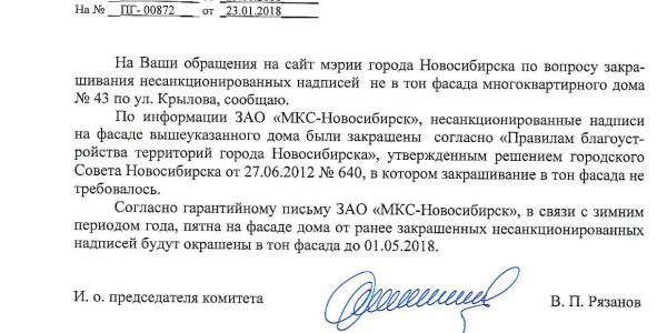 Номер жалобы:28939 Тип жалобы:Иные проблемы ЖКХ Название объекта:Управляющая Компания Регион:Новосибирская область Город:Новосибирск Адрес:ул. Крылова, 43 Описание жалобы:Не в тон закрашенные надписи Статус: