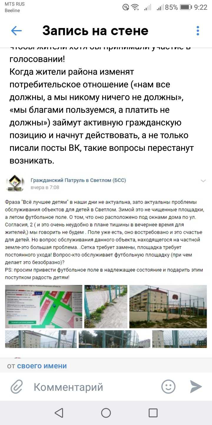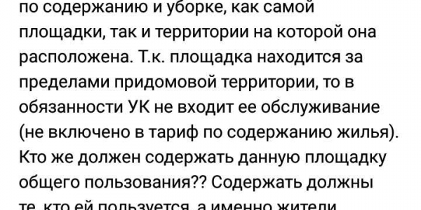 Номер жалобы:68457 Тип жалобы:Прочее Название объекта: Регион:Новосибирская область Город:посёлок Октябрьский Адрес:микрорайон Светлый Описание жалобы:НСО Мошковский район, ж/р Светлый. Вся земля жилого района (за исключением придомовых территорий и дороги по ул. Согласия) принадлежит частнику Дарневу С. П.. В этом все проблемы. В Муниципалитет он землю "передаёт" несколько лет и только на словах. В целях коммерческого интереса он обустраивает микрорайон, строит разные объекты (футбольное поле, детские площадки, площадка для выгула собак, фонтан, автобусная остановка, место отстоя общественного транспорта, волейбольная площадка) на своей земле, за свой счёт, но дальше не несёт н какой ответственности за данные объекты и они ни кем не обслуживаются,принимая не надлежащий вид и жители обвиняются в халатном отношении. Просим разобраться со сложной ситуацией в земельном вопросе и обслуживании объектов общего пользования имеющихся в Светлом.