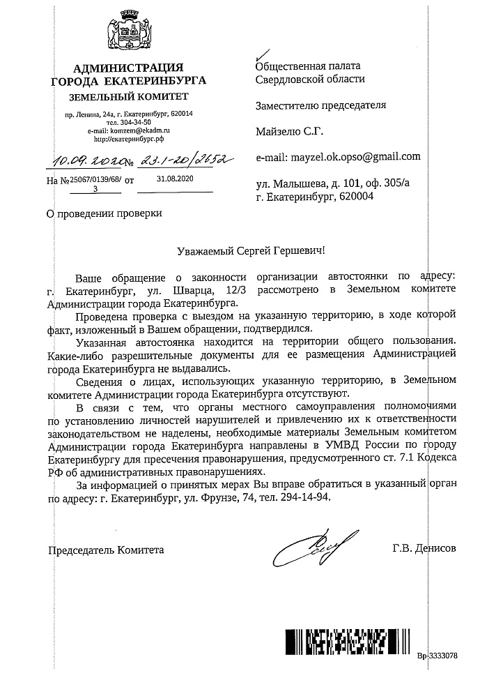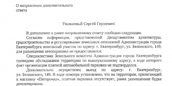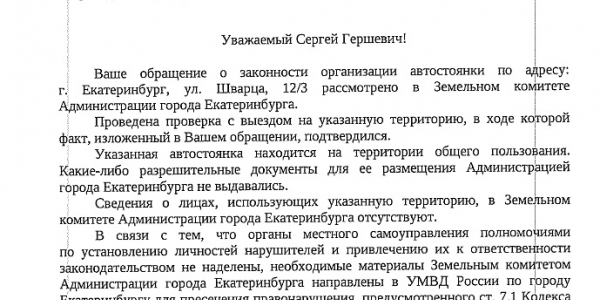 Номер жалобы:68486 Тип жалобы:Прочее Название объекта: Регион:Свердловская область Город:Екатеринбург Адрес:улица Академика Шварца, 12к3 Описание жалобы:За торговым павильоном Шварца 12/3 находится муниципальный сквер, который превратили в платную парковку. Сквер огорожен, въезд осуществляется через шлагбаум. Машины паркуются на газоне, нарушая правила благоустройства. Статус: