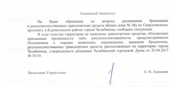 транспортных средств, расположенных на территории общего пользовании города Челябинска", принятым Челябинской городской думой 25 апреля 2017 года, в отношении большегрузового транспортного средства, стоящего возле дома 28А по Свердловскому проспекту. Статус: