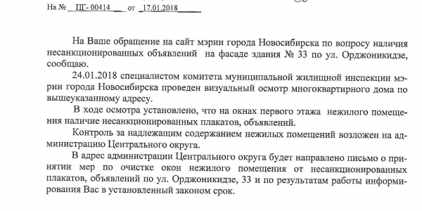 Номер жалобы:28750 Тип жалобы:Иные проблемы ЖКХ Название объекта:Управляющая Компания Регион:Новосибирская область Город:Новосибирск Адрес:ул. Орджоникидзе, 33 Описание жалобы:Объявления на фасаде дома Статус: