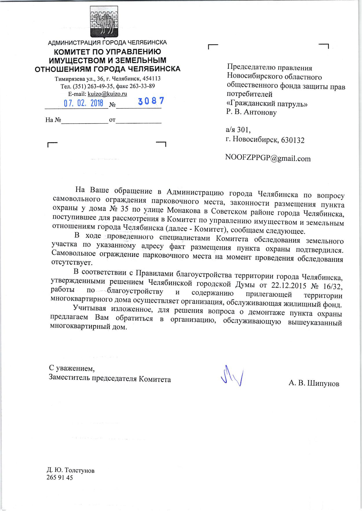 Номер жалобы:28545 Тип жалобы:Иные проблемы ЖКХ Название объекта:Мэрия Город:Челябинск Адрес:Челябинск, Переселенческая улица, 21 Описание жалобы:Незаконная будка во дворе между Монакова 35 и 31. Необходимо снести. Статус: