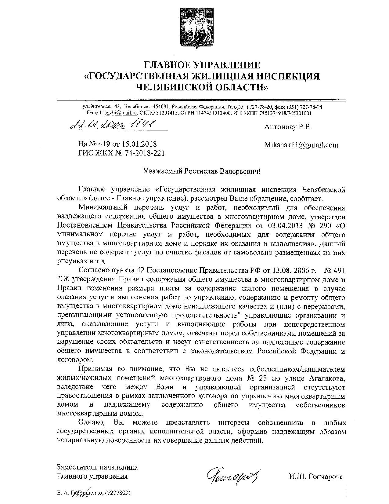 Номер жалобы:28628 Тип жалобы:Иные проблемы ЖКХ Название объекта:Управляющая компания Ленинского района - 1 Регион:Челябинская область Город:Челябинск Адрес:ул. Агалакова, 23 Описание жалобы:Уважаемая УКЛР-1 вынужден отправить жалобу в Ваш адрес. Живу в доме по ул. Агалакова 23 на протяжении уже 7 лет. В течении этого времени фасад дома и входные группы подъездов находятся в ужасающем состоянии. Убедительная просьба выполнить следующее:
