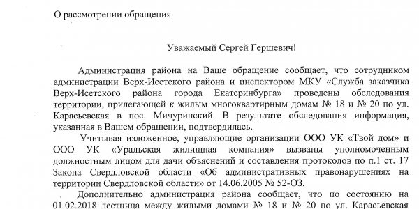 Номер жалобы:28490 Тип жалобы:Иные проблемы ЖКХ Название объекта:ООО Доверие -8 Регион:Челябинская область Город:Челябинск Адрес:ул. Сталеваров, 36А Описание жалобы:В угловом подъезде, где квартиры 40е, очень неудобно сделан козырек над подъездов, с него вода стекает прямо на лестницы, потом замерзает и там все время ледяная корка, очень опасно там спускаться. Там же безграмотно сделана водосточная труба. С неё стекает прямо на тротуар, также все замерзает, и там все время ледяная корка. Статус: