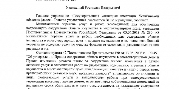 Номер жалобы:28663 Тип жалобы:Иные проблемы ЖКХ Название объекта:ООО Челябэнергострой ЖЭУ. +7(351)282-83-01 Регион:Челябинская область Город:Челябинск Адрес:ул. Трубников, 63 Описание жалобы:Незаконная реклама на фасаде дома ул. Трубников 63 в виде граффити. Компания об этом поставлена в известность двадцатых числах декабря 2017 года. По состоянию на 13.01 не устранено. Статус: